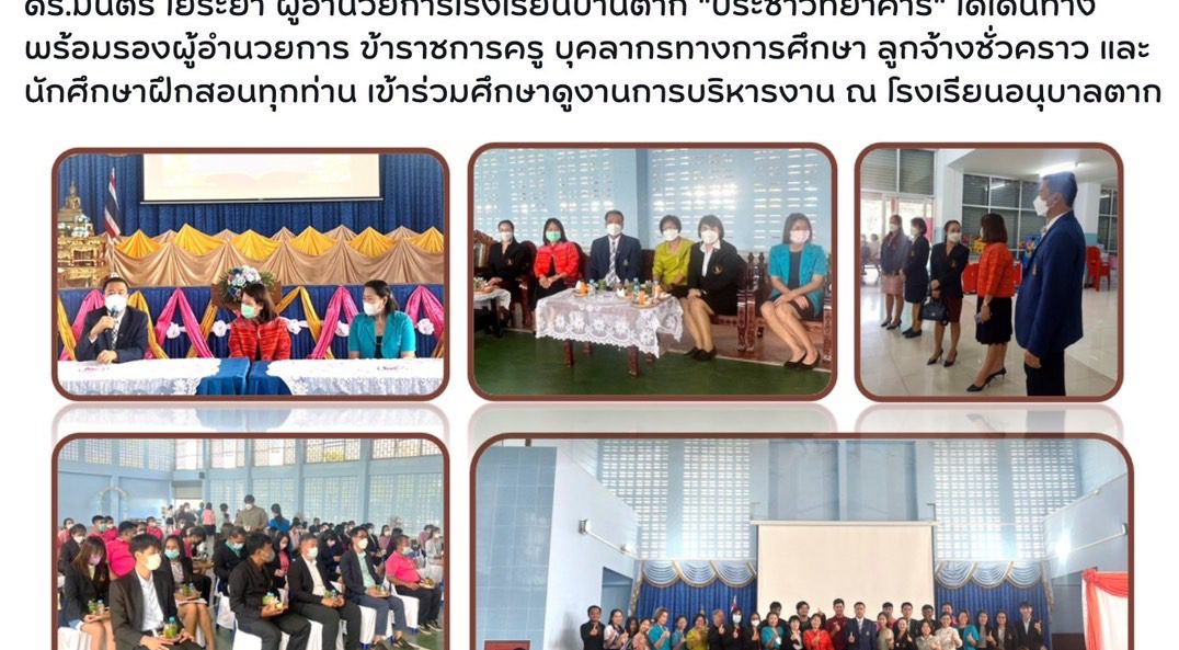 เมื่อวันที่ 4 มกราคม พ.ศ.2566 ดร.มนตรี ใยระย้า ผู้อำนวยการโรงเรียนบ้านตาก “ประชาวิทยาคาร” พร้อมรองผู้อำนวยการ ข้าราชการครู บุคลากรทางการศึกษา ลูก จ้างชั่วคราว และนักศึกษาฝึกประสบการณ์วิชาชีพครูทุกท่าน เข้าร่วมการศึกษาดูงาน การบริหารงานของโรงเรียนอนุบาลตาก ณ โรงเรียนอนุบาลตาก อำเภอเมือง จังหวัดตาก