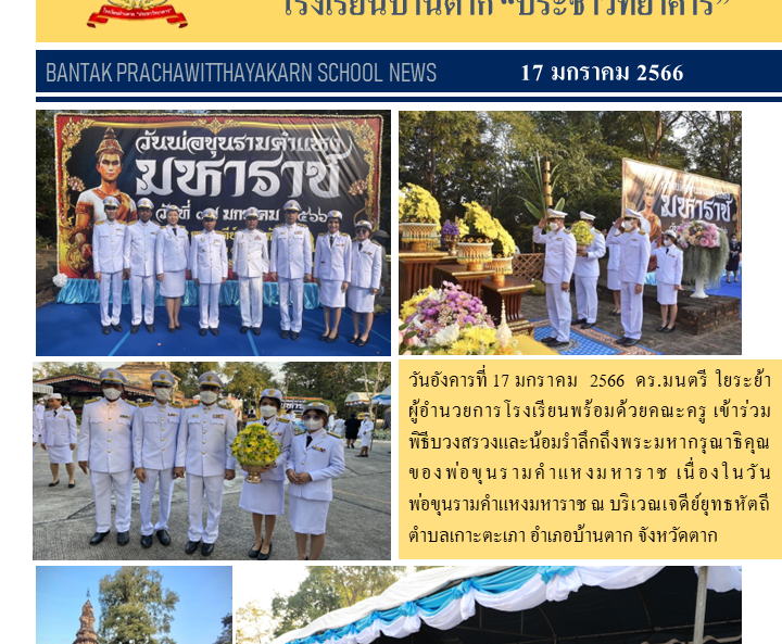 วันอังคารที่ 17 มกราคม 2566 คร.มนตรี ใยระย้า ผู้อำนวยการโรงเรียนบ้านตาก “ประชาวิทยาคาร” พร้อมด้วยคณะครู เข้าร่วมพิธีบวงสรวงและน้อมรำลึกถึงพระมหากรุณาธิคุณของพ่อขุนรามคำแหงมหาราช เนื่องในวันพ่อขุนรามคำแหงมหาราช ณ บริเวณเจดีย์ยุทธหัตถี ตำบลเกาะตะเภา อำเภอบ้านตาก จังหวัดตาก