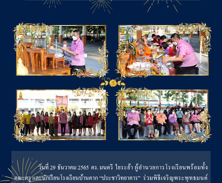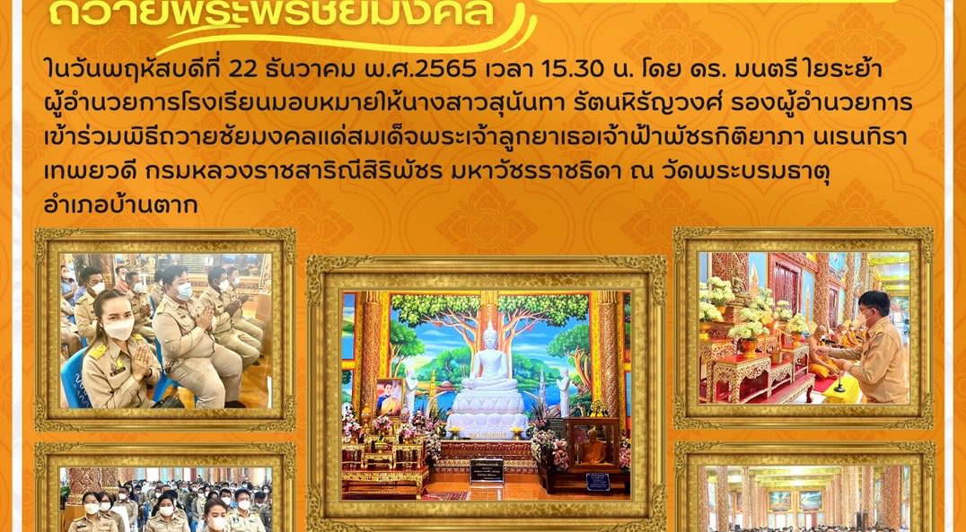 วันพฤหัสบดีที่ 22 ธันวาคม พ.ศ.2565 เวลา 15.30 น. ดร.มนตรี ใยระย้า ผู้อำนวยการโรงเรียนบ้านตาก “ประชาวิทยาคาร” มอบหมายให้นางสาวสุนันทา รัตนหิรัญวงศ์ รองผู้อำนวยการโรงเรียน เข้าร่วมพิธีถวายชัยมงคลแด่สมเด็จพระเจ้าลูกยาเธอเจ้าฟ้าพัชรกิติยาภา นเรนทิราเทพยวดี กรมหลวงราชสาริณีสิริพัชร มหาวัชรราชธิดา ให้ทรงหายจากพระอาการประชวรโดยเร็ววัน ณ วัดพระบรมธาตุบ้านตาก อำเภอบ้านตาก จังหวัดตาก