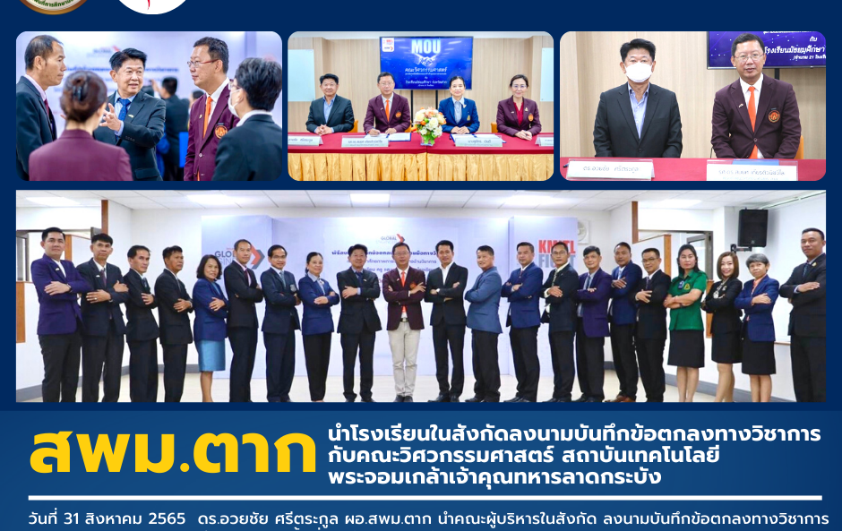 วันที่ 31 สิงหาคม 2565 ดร.อวยชัย ศรีตระกูล ผอ.สพม.ตาก นำคณะผู้บริหารในสังกัด ลงนามบันทึกข้อตกลงทางวิชาการระหว่าง โรงเรียนในสังกัดสำนักงานเขตพื้นที่การศึกษามัธยมศึกษาตาก กับคณะวิศวกรรมศาสตร์ สถาบันเทคโนโลยีพระจอมเกล้าเจ้าคุณทหารลาดกระบัง เพื่อร่วมพัฒนานักเรียนให้มีทักษะด้านวิศวกรรม รวมถึงความสามารถด้านต่างๆ และจัดการศึกษาสอดคล้องและต่อเนื่องจากระดับมัธยมศึกษาสู่ระดับอุดมศึกษา อย่างมีประสิทธิภาพสูงสุด ณ คณะวิศวกรรมศาสตร์ สถาบันเทคโนโลยีพระจอมเกล้าเจ้าคุณทหารลาดกระบัง กรุงเทพฯ
