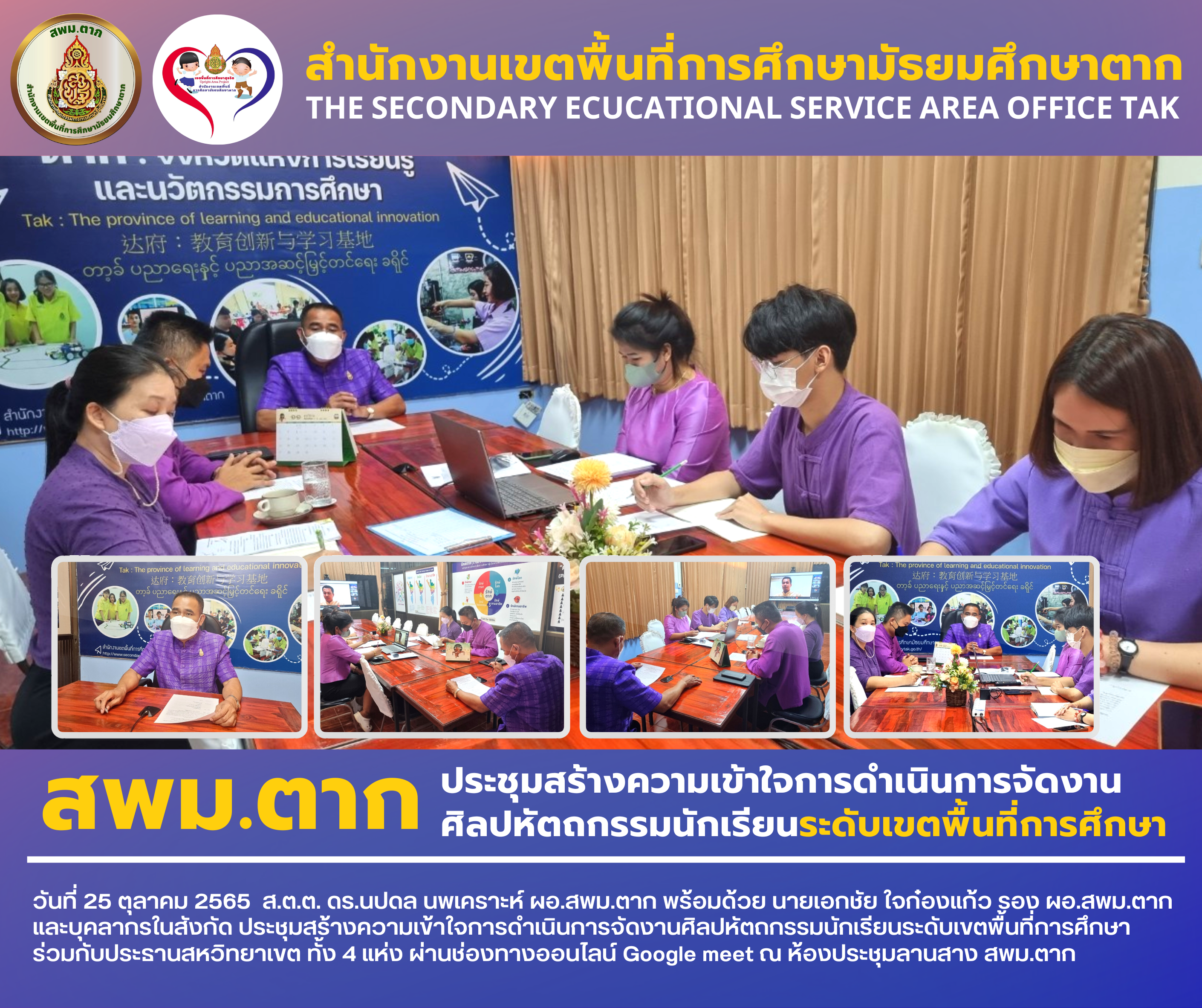 วันที่ 25 ตุลาคม 2565 ส.ต.ต. ดร.นปดล นพเคราะห์ ผอ.สพม.ตาก พร้อมด้วย นายเอกชัย ใจก๋องแก้ว รอง ผอ.สพม.ตาก และบุคลากรในสังกัด ประชุมสร้างความเข้าใจการดำเนินการจัดงานศิลปหัตถกรรมนักเรียนระดับเขตพื้นที่การศึกษา ร่วมกับประธานสหวิทยาเขต ทั้ง 4 แห่ง ผ่านช่องทางออนไลน์ Google meet ณ ห้องประชุมลานสาง สพม.ตาก