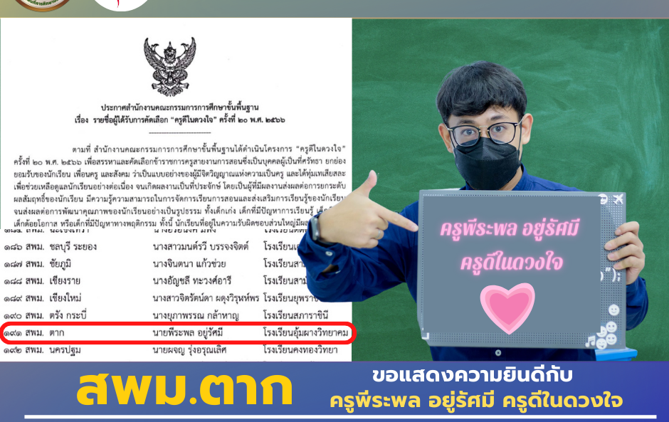 ขอแสดงความยินดีกับ นายพีระพล อยู่รัศมี ครูโรงเรียนอุ้มผางวิทยาคม ได้รับการคัดเลือกเป็น “ครูดีในดวงใจ” ครั้งที่ 20 พ.ศ.2566ซึ่งเป็นบุคคลผู้เป็นที่ศรัทธา ยกย่องยอมรับของนักเรียน เพื่อนครู และสังคม ว่าเป็นแบบอย่างของผู้มีจิตวิญญาณแห่งความเป็นครู โดยจะเข้ารับรางวัล ในวันครู วันที่ 16 มกราคม 2565 ณ หอประชุมคุรุสภา กรุงเทพมหานคร