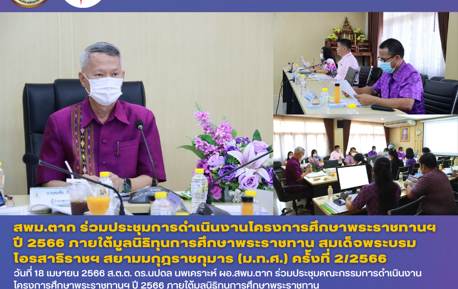 วันที่ 18 เมษายน 2566 ส.ต.ต. ดร.นปดล นพเคราะห์ ผอ.สพม.ตาก ร่วมประชุมคณะกรรมการดำเนินงานโครงการศึกษาพระราชทานฯ ปี 2566 ภายใต้มูลนิธิทุนการศึกษาพระราชทาน สมเด็จพระบรมโอรสาธิราชฯ สยามมกุฎราชกุมาร (ม.ท.ศ.) และประสานงานระดับจังหวัดตาก ครั้งที่ 2/2566 โดยมีนายสมชัย กิจเจริญรุ่งโรจน์ ผู้ว่าราชการจังหวัดตาก เป็นประธานการประชุม ณ ห้องประชุมจามจุรี อาคารเสมารักษ์ สำนักงานศึกษาธิการจังหวัดตาก