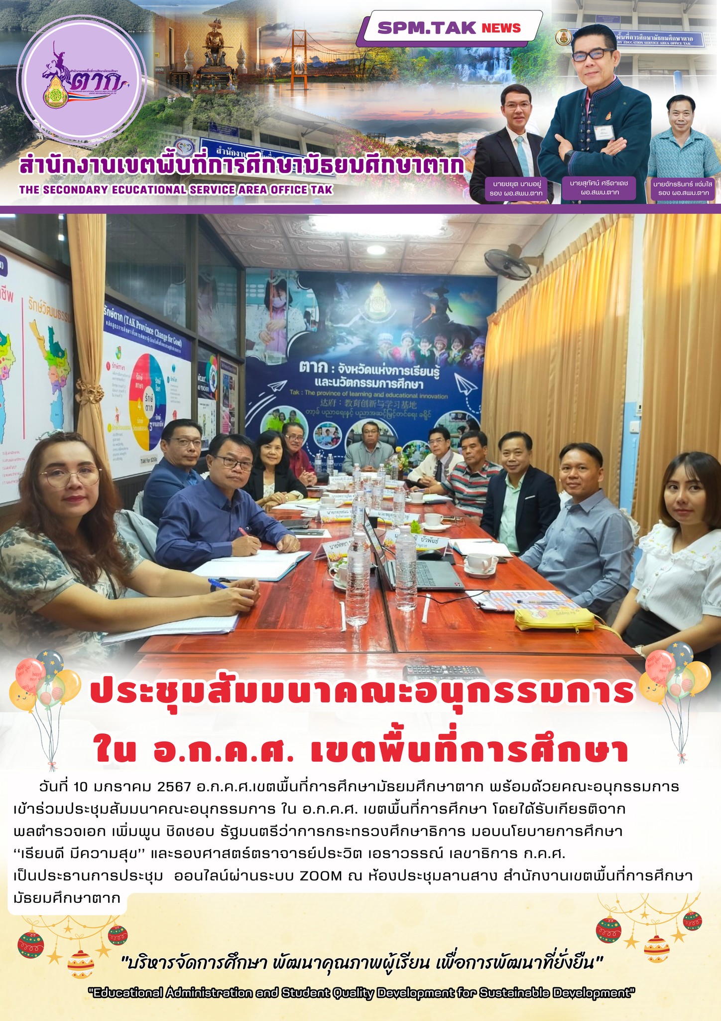 วันที่ 10 มกราคม 2567 อ.ก.ค.ศ.เขตพื้นที่การศึกษามัธยมศึกษาตาก พร้อมด้วยคณะอนุกรรมการเข้าร่วมประชุมสัมมนาคณะอนุกรรมการ ใน อ.ก.ค.ศ. เขตพื้นที่การศึกษา โดยได้รับเกียรติจาก พลตำรวจเอก เพิ่มพูน ชิดชอบ รัฐมนตรีว่าการกระทรวงศึกษาธิการ มอบนโยบายการศึกษา ‘‘เรียนดี มีความสุข’’ และรองศาสตร์ตราจารย์ประวิต เอราวรรณ์ เลขาธิการ ก.ค.ศ. เป็นประธานการประชุม ออนไลน์ผ่านระบบ ZOOM ณ ห้องประชุมลานสาง สำนักงานเขตพื้นที่การศึกษามัธยมศึกษาตาก