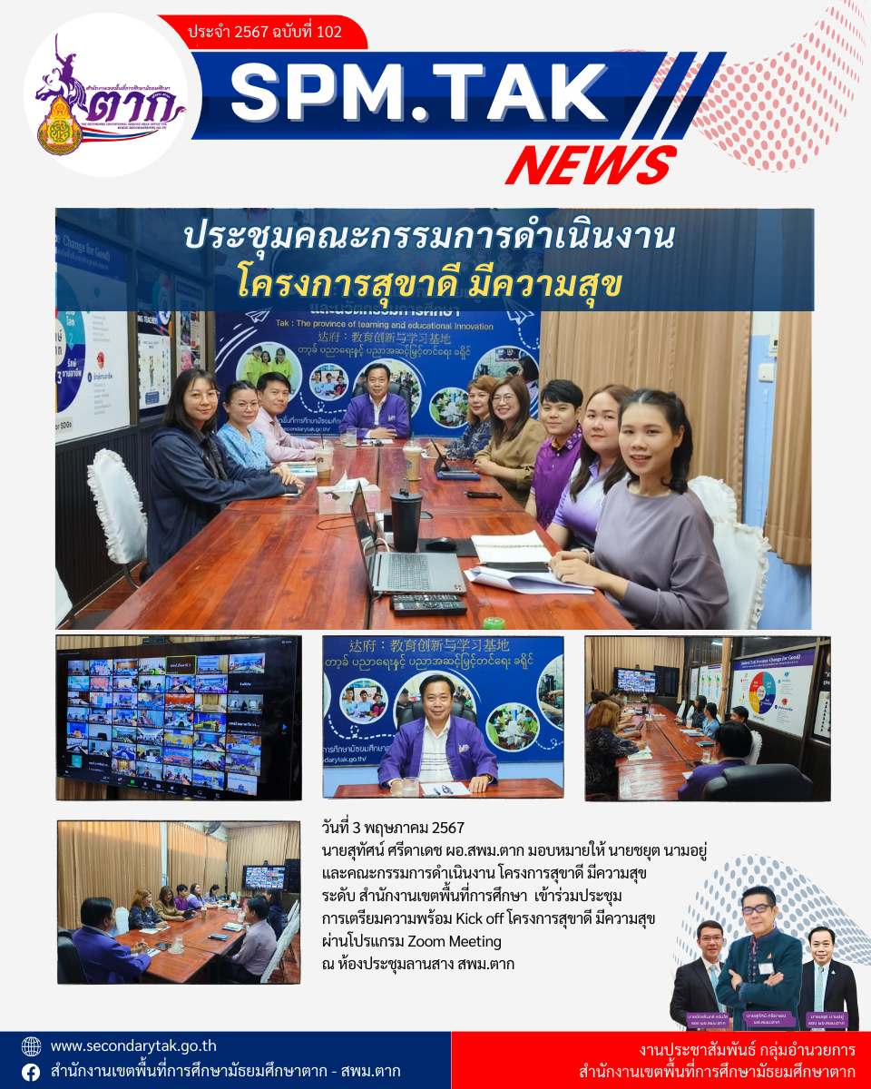 วันที่ 3 พฤษภาคม 2567 นายสุทัศน์ ศรีดาเดช ผอ.สพม.ตาก มอบหมายให้ นายชยุต นามอยู่ รอง ผอ.สพม.ตาก และคณะกรรมการดำเนินงาน โครงการสุขาดี มีความสุข ระดับ สำนักงานเขตพื้นที่การศึกษา เข้าร่วมประชุมการเตรียมความพร้อม Kick off โครงการสุขาดี มีความสุข ผ่านโปรแกรม Zoom Meeting ณ ห้องประชุมลานสาง สพม.ตาก