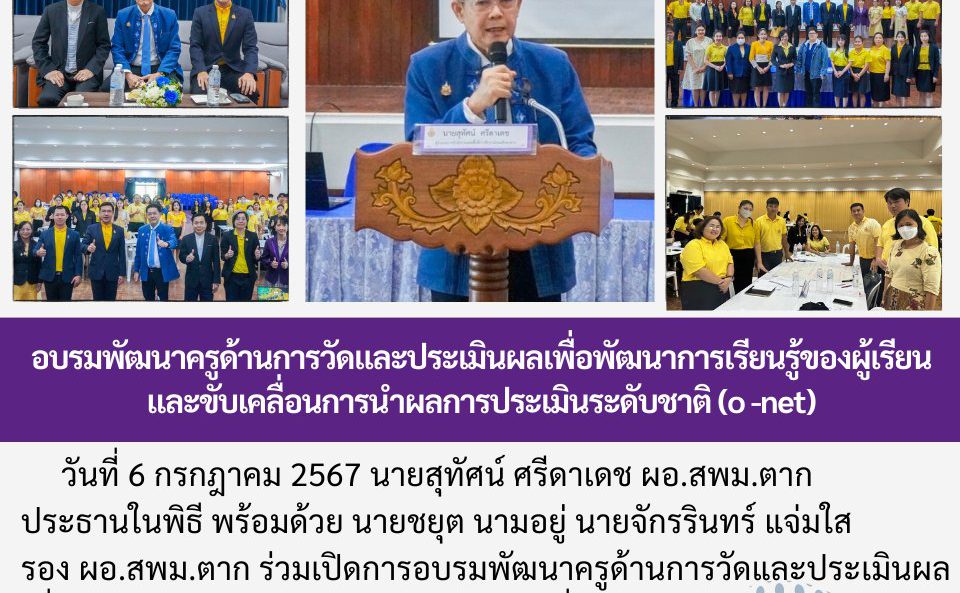วันที่ 6 กรกฎาคม 2567 นายสุทัศน์ ศรีดาเดช ผอ.สพม.ตาก ประธานในพิธี พร้อมด้วย นายชยุต นามอยู่ นายจักรรินทร์ แจ่มใส รอง ผอ.สพม.ตาก ร่วมเปิดการอบรมพัฒนาครูด้านการวัดและประเมินผล เพื่อพัฒนาการเรียนรู้ของผู้เรียนและขับเคลื่อน การนำผลการประเมินระดับชาติ (o -net) ไปใช้ ในการพัฒนาพัฒนาคุณภาพการศึกษา ณ โรงเรียนผดุงปัญญา จังหวัดตาก