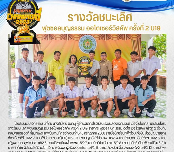 รางวัลชนะเลิศ ฟุตซอลบุญธรรม ออโตเซอร์วิสคัพ ครั้งที่ 2 U19 โรงเรียนแม่ปะวิทยาคม นำโดย นางศรีรัตน์ อินทนุ ผู้อำนวยการโรงเรียน ร่วมแสดงความยินดี เนื่องในโอกาส นักเรียนได้รับรางวัลชนะเลิศ ฟุตซอลบุญธรรม ออโตเซอร์วิสคัพ ครั้งที่ 2 U19 รายการ ฟุตซอล บุญธรรม ออโต้ เซอร์วิสคัพ ครั้งที่ 2 ร่วมกับเทศบาลอุตรดิตถ์ ที่สนามพระยาพิชัยดาบหัก รว่างวันที่ 15-16 กรกฎาคม 2566 รายชื่อนักเรียนที่เข้าร่วมแข่งขัน มีดังนี้ 1. นายยุทธจักร ก้องคีรี ม.6/2 2. นายศิริชัย วนาสรณ์(GK) ม.6/2 3. นายบุญทวี คีรีประภพ ม.6/2 4. นายว