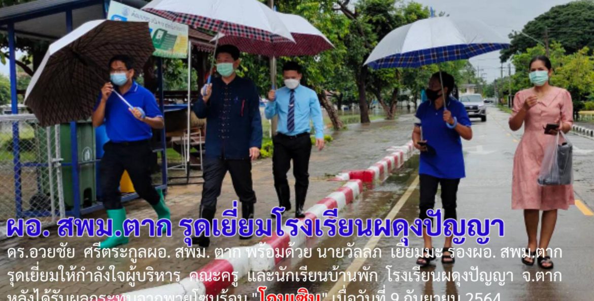 วันที่ 10 กันยายน 2564 เวลา 10.00 น. ดร.อวยชัย ศรีตระกูล ผอ.สพม.ตาก พร้อมด้วย นายวัลลภ เอี่ยมมะ รอง ผอ.สพม.ตาก ได้ลงพื้นที่ตรวจเยี่ยมและให้กำลังใจผู้บริหาร คณะครู และนักเรียนโรงเรียนผดุงปัญญา อ.เมือง จ.ตาก หลังจากประสบเหตุน้ำท่วม เนื่องจากเมื่อวันที่ 9 กันยายน 2564 เกิดฝนตกหนักต่อเนื่องหลายชั่วโมง และการระบายน้ำไม่ทัน ทำให้เกิดน้ำท่วมสูงในบริเวณหน้าโรงเรียน สนามฟุตบอล อาคารเรียน สำนักงาน หอพักนอนนักเรียน และบ้านพักครู ในการนี้ ดร.อวยชัย ศรีตระกูล ผอ.สพม.ตาก ได้ให้กำลังใจ ดูสภาพปัญหาที่เกิดขึ้น