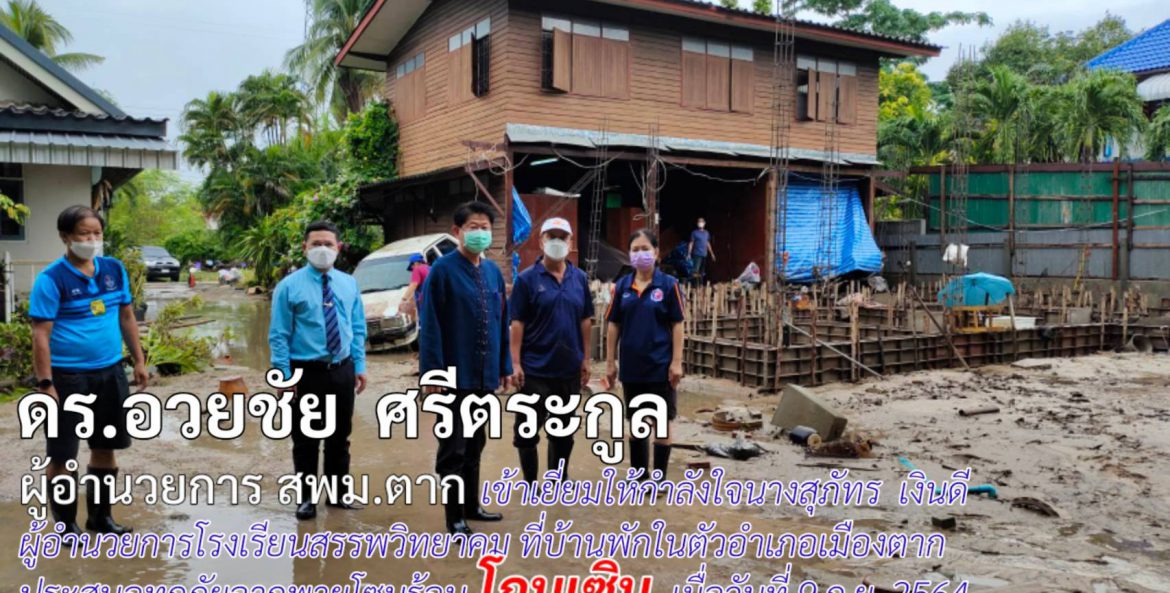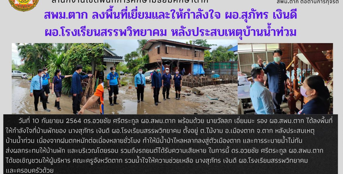 วันที่ 10 กันยายน 2564 ดร.อวยชัย ศรีตระกูล ผอ.สพม.ตาก พร้อมด้วย นายวัลลภ เอี่ยมมะ รอง ผอ.สพม.ตาก ได้ลงพื้นที่ให้กำลังใจที่บ้านพักของ นางสุภัทร เงินดี ผอ.โรงเรียนสรรพวิทยาคม ตั้งอยู่ ต.ไม้งาม อ.เมืองตาก จ.ตาก หลังประสบเหตุบ้านน้ำท่วม เนื่องจากฝนตกหนักต่อเนื่องหลายชั่วโมง ทำให้มีน้ำป่าไหลหลากลงสู่ตัวเมืองตาก และการระบายน้ำไม่ทัน ส่งผลกระทบให้บ้านพัก และบริเวณโดยรอบ รวมถึงรถยนต์ได้รับความเสียหาย ในการนี้ ดร.อวยชัย ศรีตระกูล ผอ.สพม.ตาก ได้ขอเชิญชวนให้ผู้บริหาร คณะครูจังหวัดตาก รวมน้ำใจให้ความช่วยเหล
