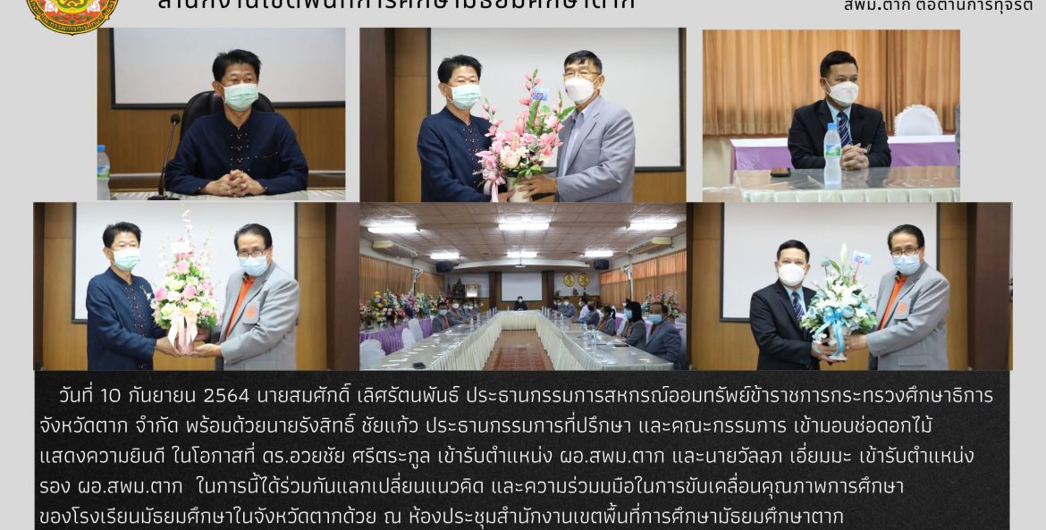 วันที่ 10 กันยายน 2564 นายสมศักดิ์ เลิศรัตนพันธ์ ประธานกรรมการสหกรณ์ออมทรัพย์ข้าราชการกระทรวงศึกษาธิการจังหวัดตาก จำกัด พร้อมด้วยนายรังสิทธิ์ ชัยแก้ว ประธานกรรมการที่ปรึกษา และคณะกรรมการ เข้ามอบช่อดอกไม้ แสดงความยินดี ในโอกาสที่ ดร.อวยชัย ศรีตระกูล เข้ารับตำแหน่ง ผอ.สพม.ตาก และนายวัลลภ เอี่ยมมะ เข้ารับตำแหน่ง รอง ผอ.สพม.ตาก ในการนี้ได้ร่วมกันแลกเปลี่ยนแนวคิด และความร่วมมมือในการขับเคลื่อนคุณภาพการศึกษาของโรงเรียนมัธยมศึกษาในจังหวัดตากด้วย ณ ห้องประชุมสำนักงานเขตพื้นที่การศึกษามัธยมศึกษาตาก