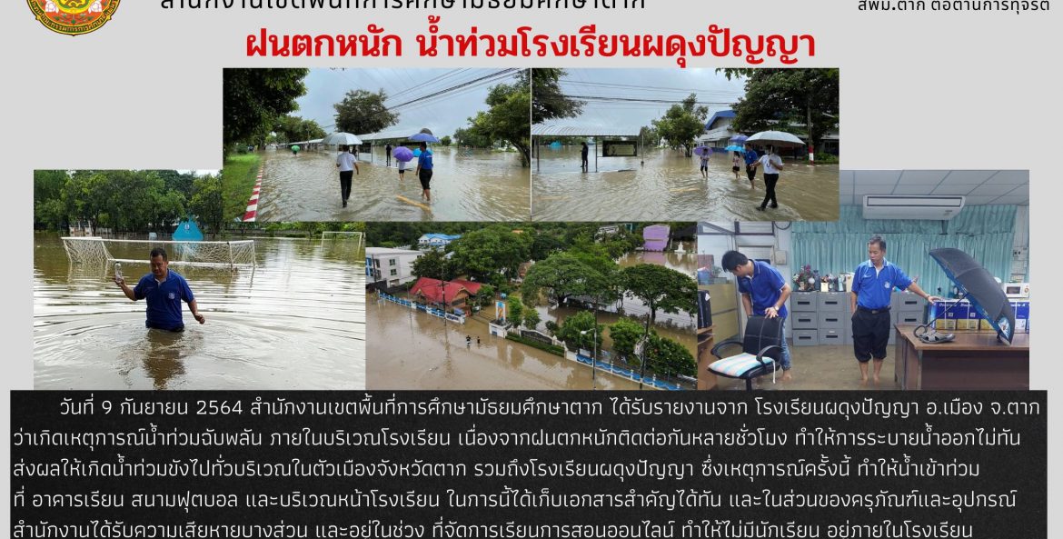 วันที่ 9 กันยายน 2564 สำนักงานเขตพื้นที่การศึกษามัธยมศึกษาตาก ได้รับรายงานจาก โรงเรียนผดุงปัญญา อ.เมือง จ.ตาก ว่าเกิดเหตุการณ์น้ำท่วมฉับพลัน ภายในบริเวณโรงเรียน เนื่องจากฝนตกหนักติดต่อกันหลายชั่วโมง ทำให้การระบายน้ำออกไม่ทัน ส่งผลให้เกิดน้ำท่วมขังไปทั่วบริเวณในตัวเมืองจังหวัดตาก รวมถึงโรงเรียนผดุงปัญญา ซึ่งเหตุการณ์ครั้งนี้ ทำให้น้ำเข้าท่วมที่ อาคารเรียน สนามฟุตบอล และบริเวณหน้าโรงเรียนในการนี้ได้เก็บเอกสารสำคัญได้ทัน และในส่วนของครุภัณฑ์และอุปกรณ์สำนักงานได้รับความเสียหายบางส่วน และอยู่ในช่วง ท