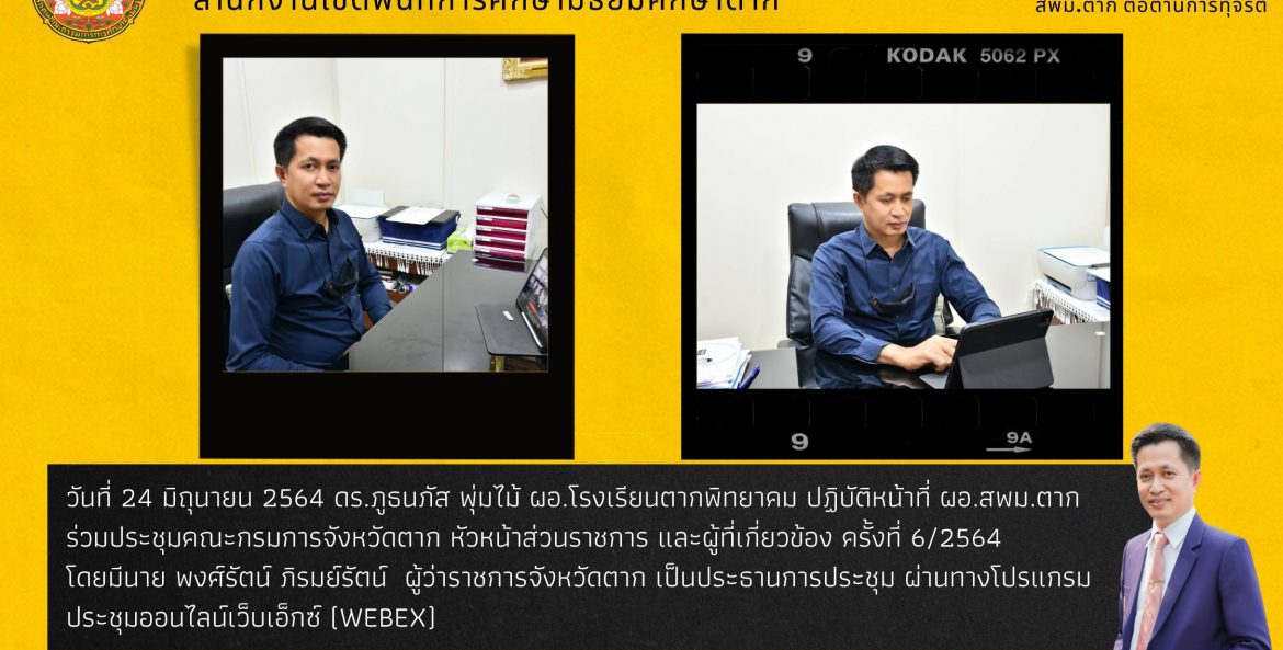 วันที่ 24 มิถุนายน 2564 ดร.ภูธนภัส พุ่มไม้ ผอ.โรงเรียนตากพิทยาคม ปฏิบัติหน้าที่ ผอ.สพม.ตาก ร่วมประชุมคณะกรมการจังหวัดตาก หัวหน้าส่วนราชการ และผู้ที่เกี่ยวข้อง ครั้งที่ 6/2564 โดยมีนาย พงศ์รัตน์ ภิรมย์รัตน์ ผู้ว่าราชการจังหวัดตาก เป็นประธานการประชุม ผ่านทางโปรแกรมประชุมออนไลน์เว็บเอ็กซ์ (Webex)