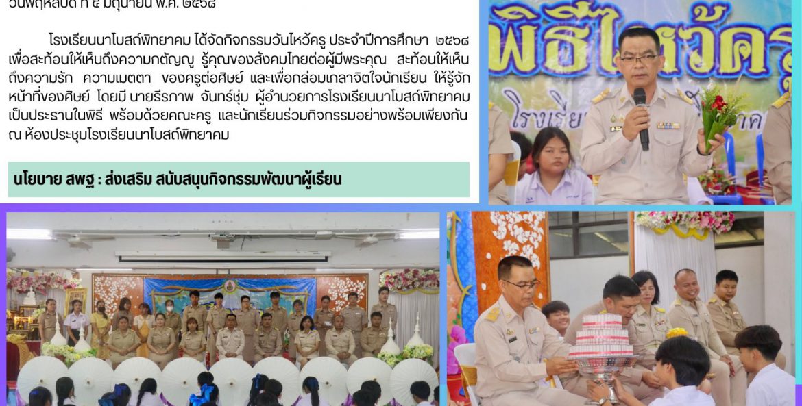 วันพฤหัสบดี ที่ ๕ มิถุนายน พ.ศ. ๒๕๖๘ โรงเรียนนาโบสถ์พิทยาคม ได้จัดกิจกรรมวันไหว้ครู ประจำปีการศึกษา ๒๕๖๘ เพื่อสะท้อนให้เห็นถึงความกตัญญู รู้คุณของสังคมไทยต่อผู้มีพระคุณ สะท้อนให้เห็นถึงความรัก ความเมตตา ของครูต่อศิษย์ และเพื่อกล่อมเกลาจิตใจนักเรียน ให้รู้จักหน้าที่ของศิษย์ โดยมี นายธีรภาพ จันทร์ชุ่ม ผู้อำนวยการโรงเรียนนาโบสถ์พิทยาคมเป็นประธานในพิธี พร้อมด้วยคณะครู และนักเรียนร่วมกิจกรรมอย่างพร้อมเพียงกัน ณ ห้องประชุมโรงเรียนนาโบสถ์พิทยาคม <iframe src=”https://www.facebook.com/plugins/po