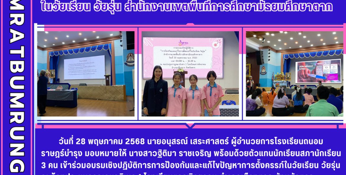 วันศุกร์ที่ 28 พฤศจิกายน 2568 นายอนุสรณ์ เสระศาสตร์ ผู้อำนวยการโรงเรียนถนอมราษฎร์บำรุง มอบโล่รางวัล และเกียรติบัตร ให้กับนักเรียนห้องเรียนกีฬา ผู้ฝึกสอน โค้ช ได้รับรางวัลชนะเลิศ ฟุตบอล 7 คน มหกรรมวิชาการ บนฐานทักษะ และนวัตกรรม วิทยาลัยนอร์ทเทิร์นตาก ครั้งที่ 2 ประจำปี 2568 พร้อมกล่าวชื่นชม และ ให้กำลังใจนักกีฬาที่ได้สร้างชื่อเสียงให้กับโรงเรียน