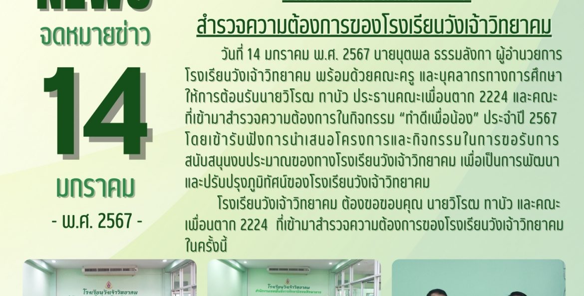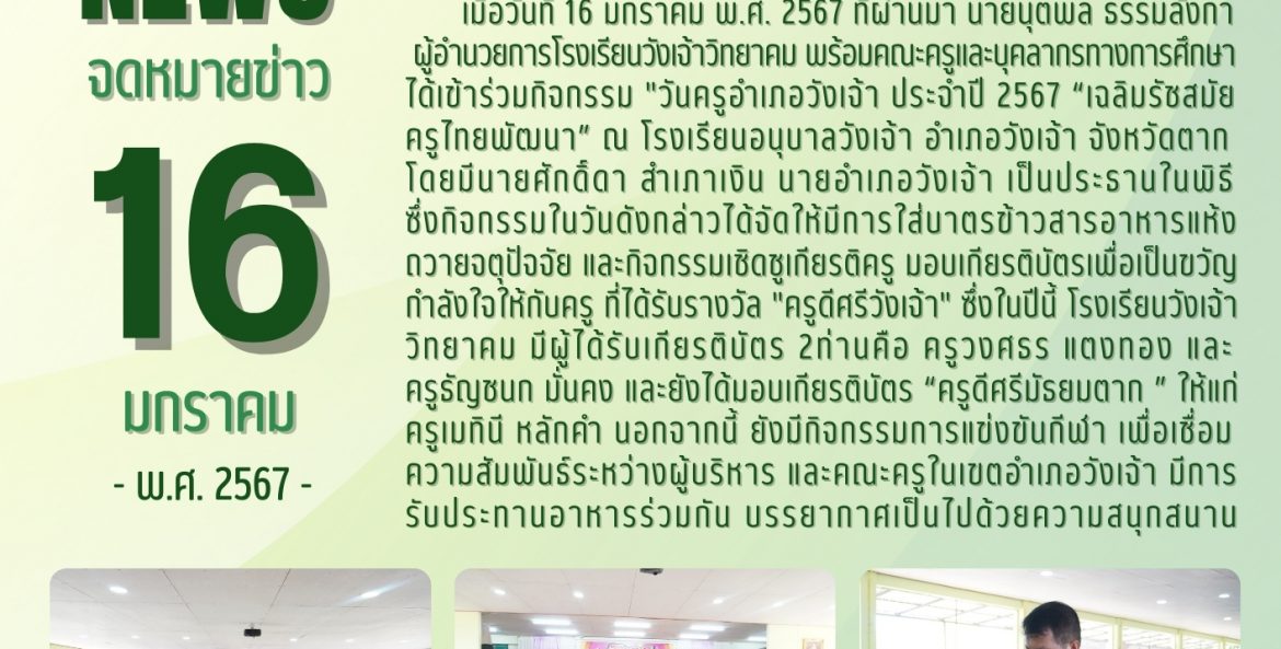 โรงเรียนวังเจ้าวิทยาคม กิจกรรม “วันครูอำเภอวังเจ้า ประจำปี 2567 วงศธร แตงทอง 17 มกราคม 2567 อ่านเพิ่มเติม