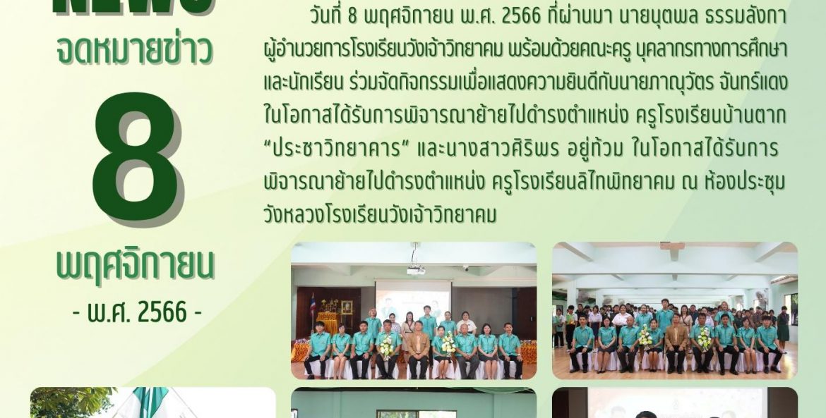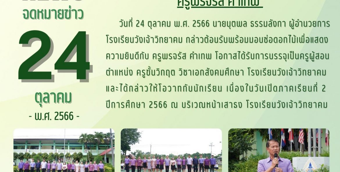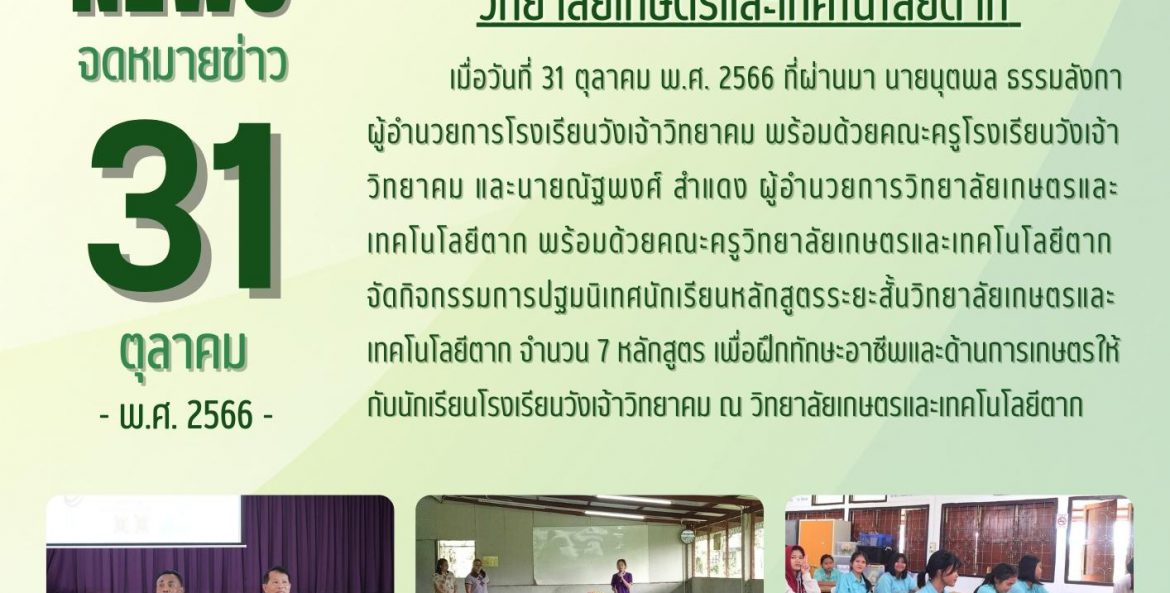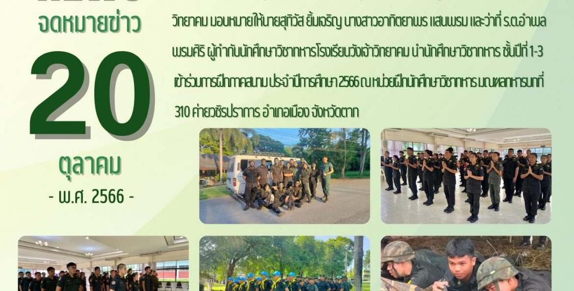 เมื่อวันที่ 9 – 20 ตุลาคม พ.ศ. 2566 นายนุตพล ธรรมลังกา ผู้อำนวยการโรงเรียนวังเจ้าวิทยาคม มอบหมายให้นายสุทิวัส ยิ้มเจริญ นางสาวอาทิตยาพร แสนพรม และว่าที่ ร.ต.อำพล พรมศิริ ผู้กำกับนักศึกษาวิชาทหารโรงเรียนวังเจ้าวิทยาคม นำนักศึกษาวิชาทหาร ชั้นปีที่ 1-3 เข้าร่วมการฝึกภาคสนาม ประจำปีการศึกษา 2566 ณ หน่วยฝึกนักศึกษาวิชาทหาร มณฑลทหารบกที่ 310 ค่ายวชิรปราการ อำเภอเมือง จังหวัดตาก
