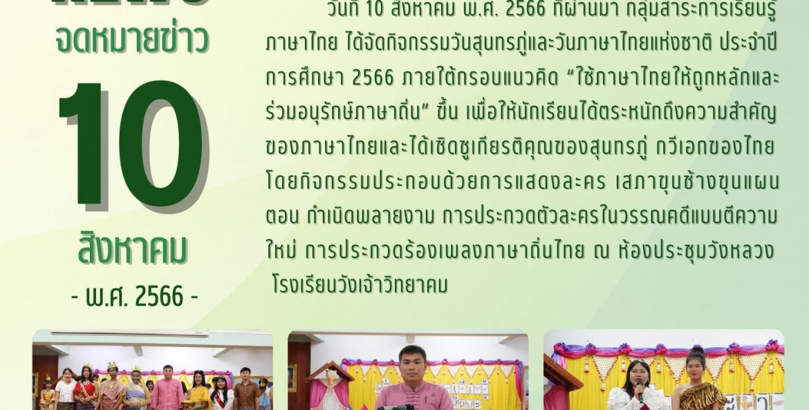 โรงเรียนวังเจ้าวิทยาคม กิจกรรมวันสุนทรภู่และวันภาษาไทยแห่งชาติ 2566 วงศธร แตงทอง 11 สิงหาคม 2566 อ่านเพิ่มเติม