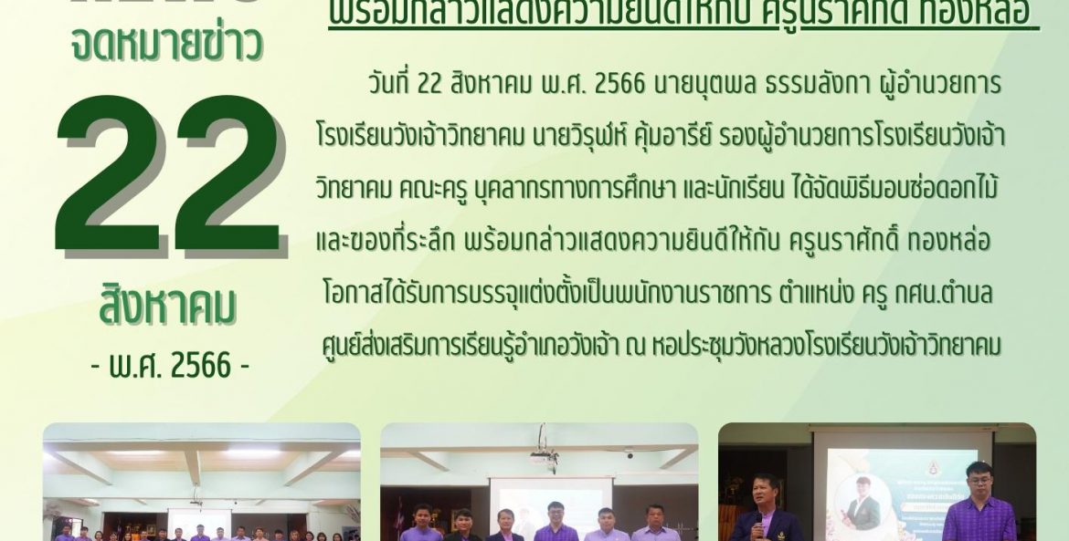 โรงเรียนวังเจ้าวิทยาคม พิธีมอบช่อดอกไม้และของที่ระลึก พร้อมกล่าวแสดงความยินดีให้กับ ครูนราศักดิ์ ทองหล่อ วงศธร แตงทอง 22 สิงหาคม 2566 อ่านเพิ่มเติม