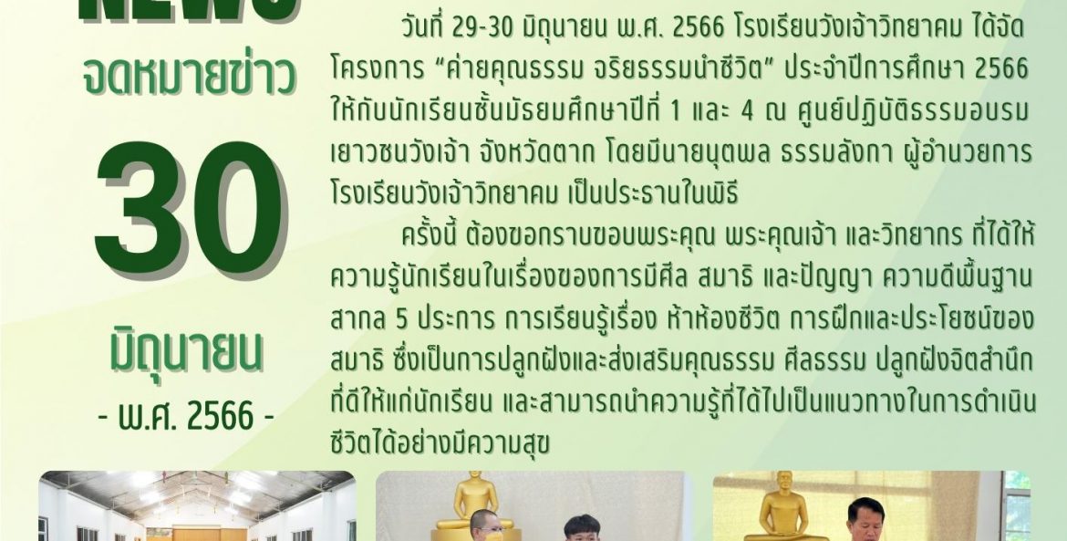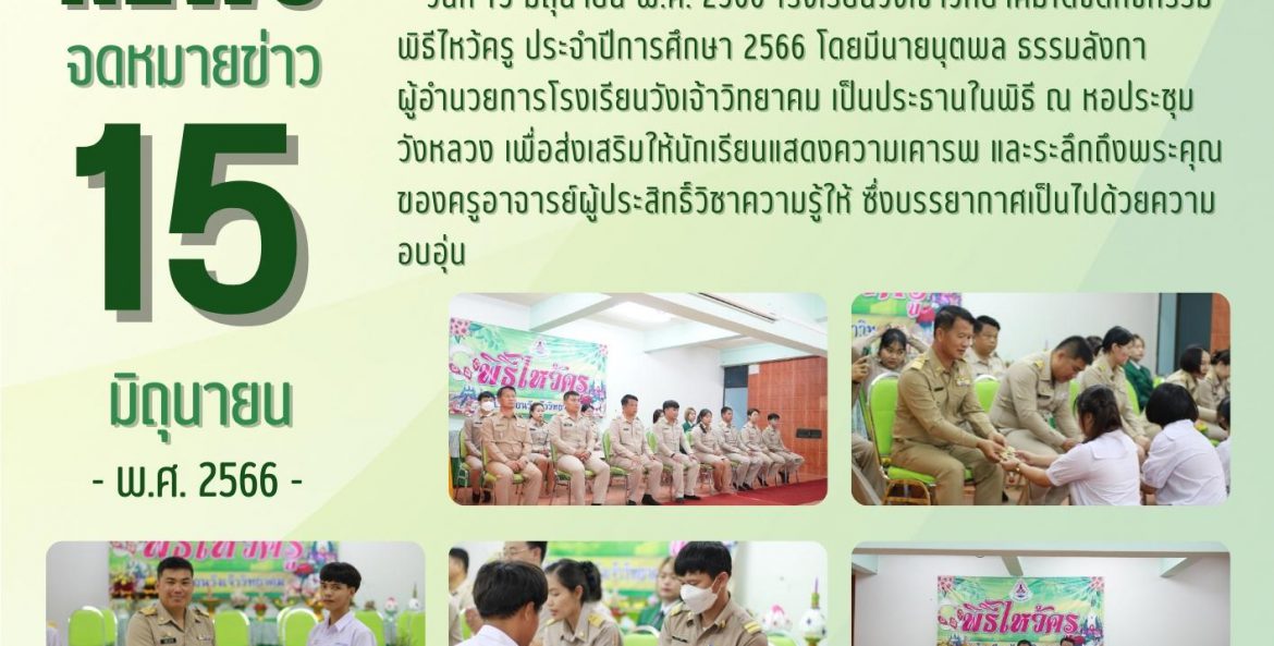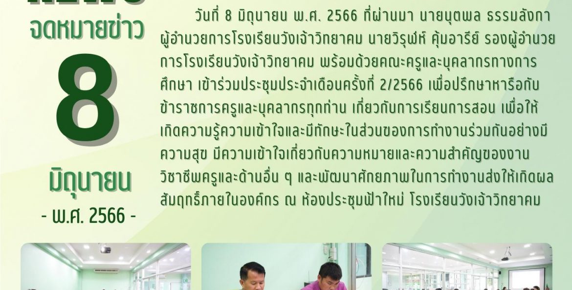 วันที่ 8 มิถุนายน พ.ศ. 2566 ที่ผ่านมา นายนุตพล ธรรมลังกา ผู้อำนวยการโรงเรียนวังเจ้าวิทยาคม นายวิรุฬห์ คุ้มอารีย์ รองผู้อำนวยการโรงเรียนวังเจ้าวิทยาคม พร้อมด้วยคณะครูและบุคลากรทางการศึกษา เข้าร่วมประชุมประจำเดือนครั้งที่ 2/2566 เพื่อปรึกษาหารือ กับข้าราชการครูและบุคลากรทุกท่าน เกี่ยวกับการเรียนการสอน เพื่อให้เกิดความรู้ความเข้าใจและมีทักษะในส่วนของการทำงานร่วมกันอย่างมีความสุข มีความเข้าใจเกี่ยวกับความหมายและความสำคัญของงานวิชาชีพครูและด้านอื่นๆ และพัฒนาศักยภาพในการทำงานส่งให้เกิดผลสัมฤทธิ์ภายในอ