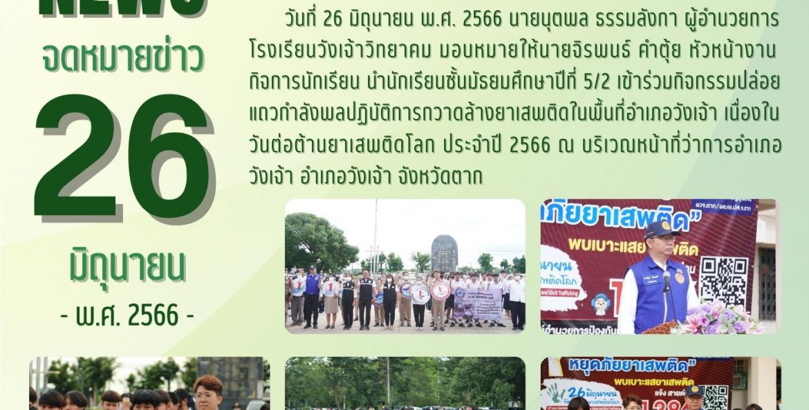 วันที่ 26 มิถุนายน พ.ศ. 2566 นายนุตพล ธรรมลังกา ผู้อำนวยการโรงเรียนวังเจ้าวิทยาคม มอบหมายให้นายจิรพนธ์ คำตุ้ย หัวหน้างานกิจการนักเรียน นำนักเรียนชั้นมัธยมศึกษาปีที่ 5/2 เข้าร่วมกิจกรรมปล่อยแถวกำลังพลปฏิบัติการกวาดล้างยาเสพติดในพื้นที่อำเภอวังเจ้า เนื่องในวันต่อต้านยาเสพติดโลก ประจำปี 2566 ณ บริเวณหน้าที่ว่าการอำเภอวังเจ้า อำเภอวังเจ้า จังหวัดตาก