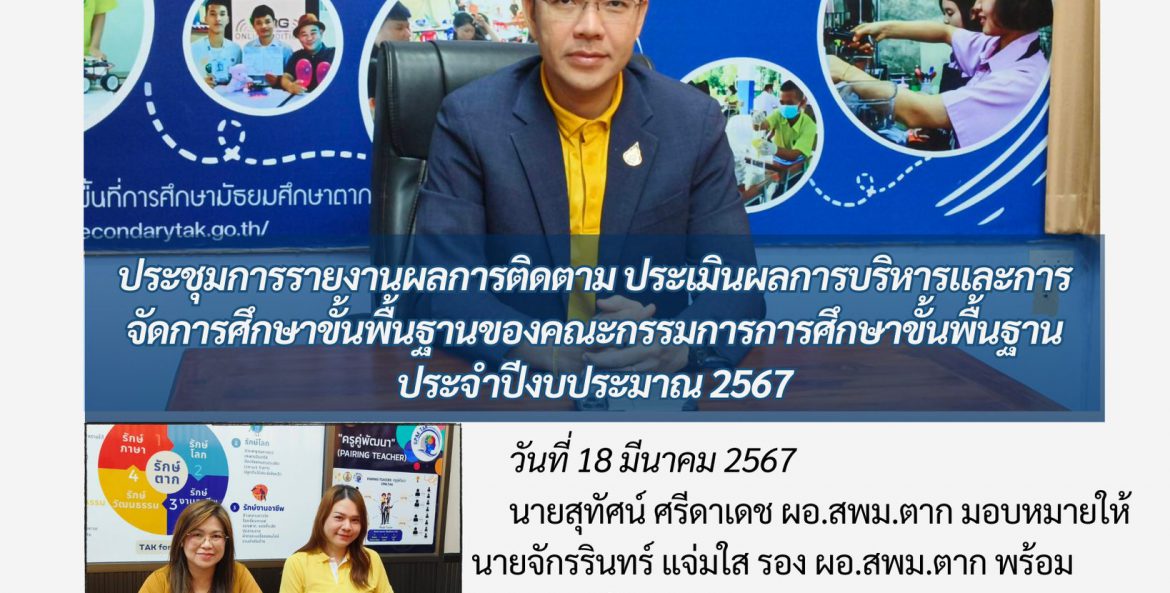 วันที่ 18 มีนาคม 2567 นายสุทัศน์ ศรีดาเดช ผอ.สพม.ตาก มอบหมายให้ นายจักรรินทร์ แจ่มใส รอง ผอ.สพม.ตาก พร้อมบุคลากร เข้าร่วมประชุมการรายงานผลการติดตาม ประเมินผลการบริหารและการจัดการศึกษา ขั้นพื้นฐานของคณะกรรมการการศึกษา ขั้นพื้นฐาน ประจำปีงบประมาณ 2567 ณ ห้องประชุม ลานสาง สพม.ตาก