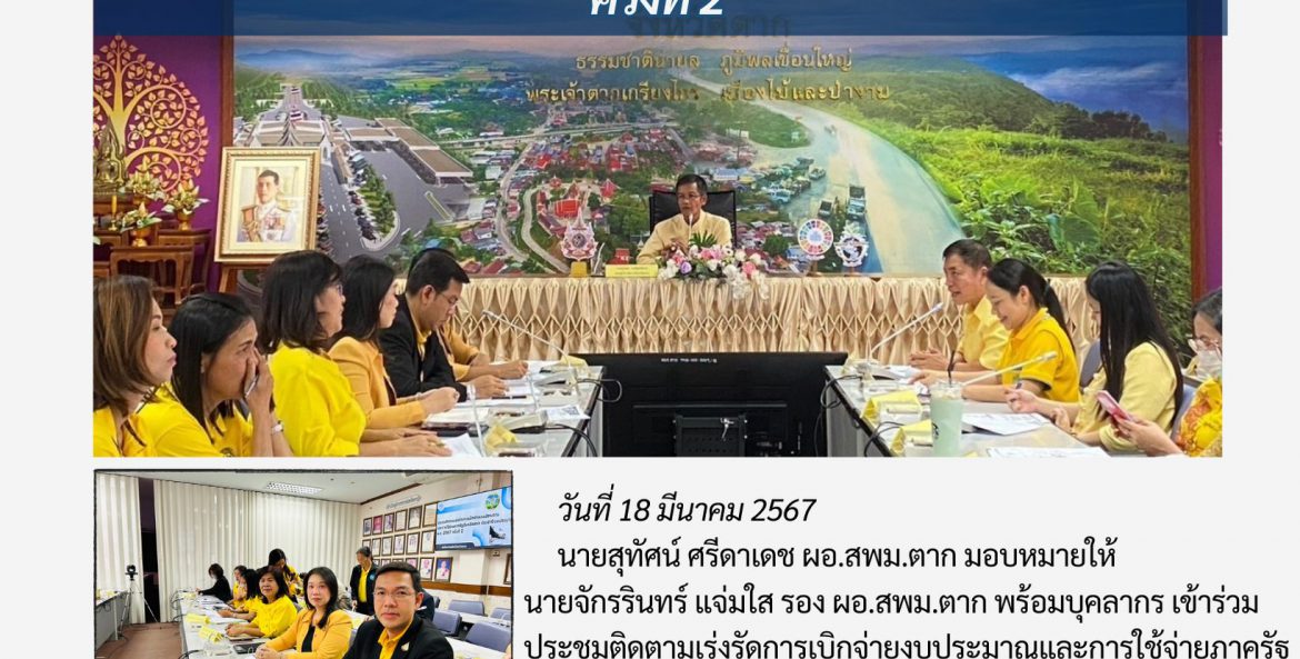 วันที่ 18 มีนาคม 2567 นายสุทัศน์ ศรีดาเดช ผอ.สพม.ตาก มอบหมายให้ นายจักรรินทร์ แจ่มใส รอง ผอ.สพม.ตาก พร้อมบุคลากร เข้าร่วมประชุมติดตามเร่งรัดการเบิกจ่ายงบประมาณและการใช้จ่ายภาครัฐจังหวัดตากประจำปีงบประมาณ 2567 ครั้งที่ 2ได้มีการติดตามเร่งรัดการเบิกจ่าย งบประมาณ และการใช้จ่ายภาครัฐ อย่างต่อเนื่อง เปีนประจำทุกปี เพื่อให้ผลการเบิกจ่ายงบประมาณ และการใช้จ่ายภาครัฐของหน่วยงานภายในจังหวัดตากเปีนไปอย่างมีประสิทธิภาพตามเบีาหมายที่รัฐบาลกำหนด