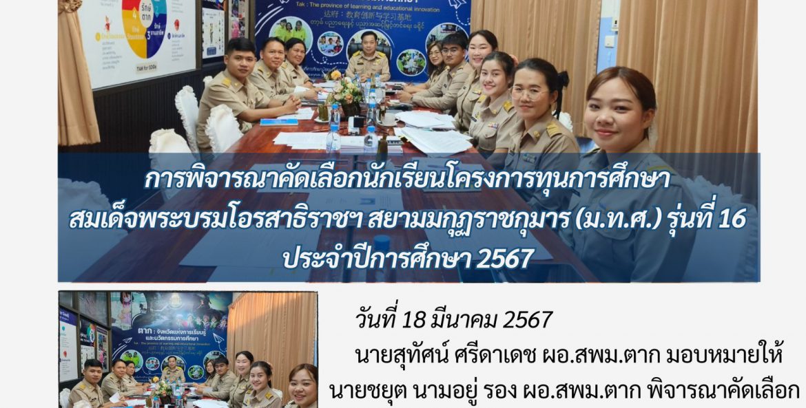 วันที่ 18 มีนาคม 2567 นายสุทัศน์ ศรีดาเดช ผอ.สพม.ตาก มอบหมายให้ นายชยุต นามอยู่ พิจารณาคัดเลือก “โครงการส่งเสริมนักเรียนผู้มีคุณธรรมจริยธรรมและบำเพ็ญประโยชน์ เข้าศึกษาต่อในสถาบันอุดมศึกษา” โครงการเด็กดีมีที่เรียนประจำปีการศึกษา 2567 มหาวิทยาลัยแม่โจ้ ณ ห้องประชุมลานสาง