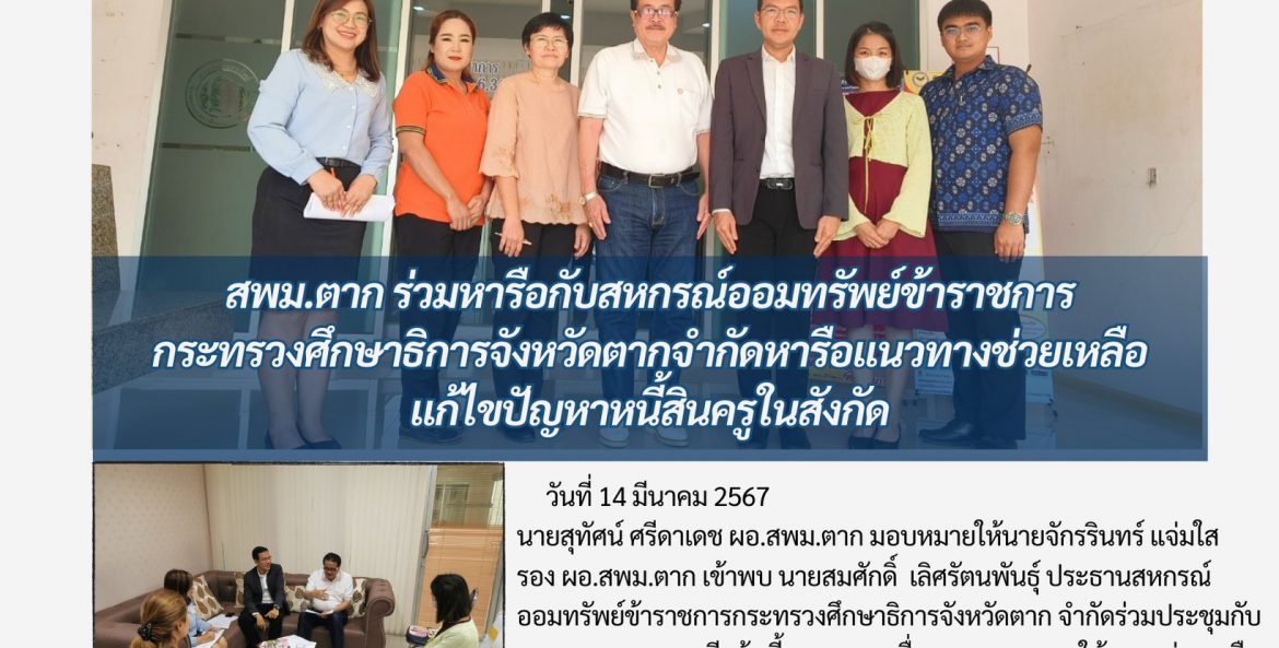 วันที่ 14 มีนาคม 2567 นายสุทัศน์ ศรีดาเดช ผอ.สพม.ตาก มอบหมายให้นายจักรรินทร์ แจ่มใส รอง ผอ.สพม.ตาก เข้าพบ นายสมศักดิ์ เลิศรัตนพันธุ์ ประธานสหกรณ์ ออมทรัพย์ข้าราชการกระทรวงศึกษาธิการจังหวัดตาก จำกัดร่วมประชุมกับคณะกรรมการสถานีแก้หนี้ สพม.ตากเพื่อหาแนวทางการให้ความช่วยเหลือ ข้าราชการครูที่ลงทะเบียนเข้าร่วมโครงการแก้ไขปัญหาหนี้สินข้าราชการครูและบุคลากรทางการศึกษา“สถานีแก้หนี้ สพฐ.” ในสังกัด สพม.ตาก ผ่านระบบ DEBT OBEC ระบบแก้หนี้ สพฐ.จำนวน 2 ราย โดยสหกรณ์ออมทรัพย์ข้าราชการกระทรวงศึกษาธิการ จังหวัดตา