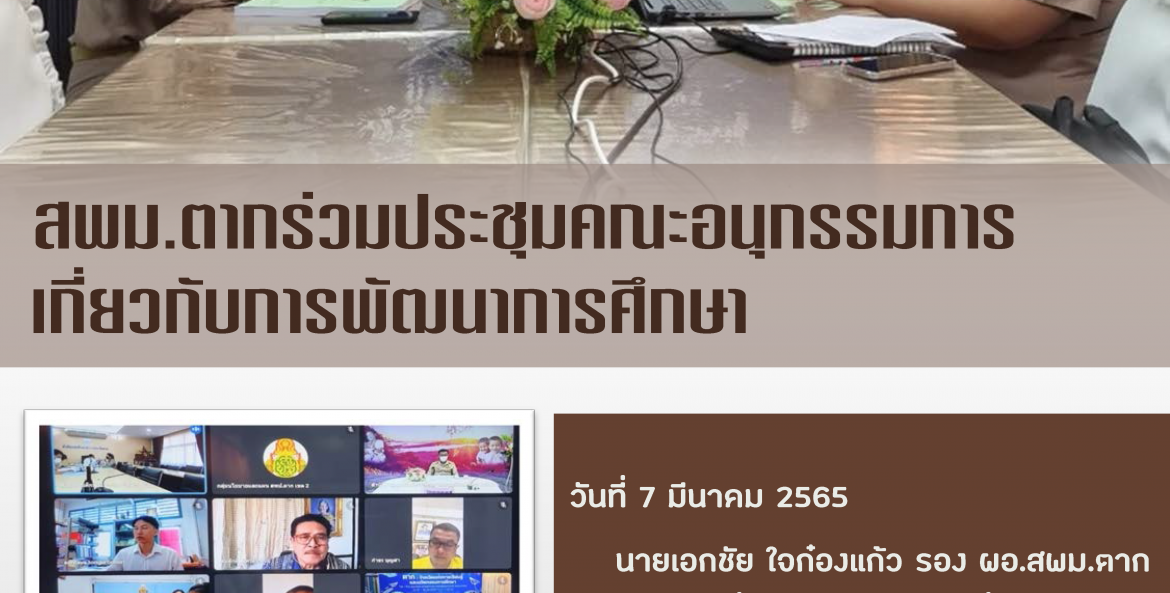 วันที่ 7 มีนาคม 2565 นายเอกชัย ใจก๋องแก้ว รอง ผอ.สพม.ตาก พร้อมด้วยกลุ่มนโยบายและแผนร่วมประชุมคณะอนุกรรมการเกี่ยวกับการพัฒนาการศึกษา โดยมีนายณรงค์ นาคชัยยะ ศึกษาธิการจังหวัดตาก เป็นประธานการประชุม ผ่านช่องทาง Google Meet ณ ห้องประชุมลานสาง สพม.ตาก