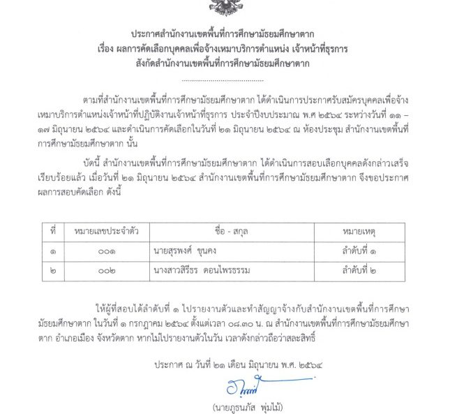 วันที่ 21 มิถุนายน 2564 สำนักงานเขตพื้นที่การศึกษามัธยมศึกษาตาก สอบสัมภาษณ์บุคคลเพื่อจ้างเหมาบริการตำแหน่งเจ้าหน้าที่ธุรการ ประจำปีงบประมาณ พ.ศ ๒๕๖๔ โดยมีนายนุตพล ธรรมลังกา ผู้อำนวยการโรงเรียนวังเจ้าวิทยาคม ที่ปรึกษากลุ่มอำนวยการ นายสมเจตน์ เนียมก้อน ศึกษานิเทศก์ชำนาญการ และนางฤทัยกัญญา ชูทอง นักประชาสัมพันธ์ชำนาญการ เป็นคณะกรรมการในการสอบคัดเลือก ณ ห้องประชุมสำนักงานเขตพื้นที่การศึกษามัธยมศึกษาตาก