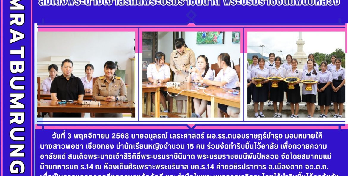 วันที่ 3 พฤศจิกายน 2568 นายอนุสรณ์ เสระศาสตร์ ผอ.รร.ถนอมราษฎร์บำรุง มอบหมายให้นางสาวพอตา เชียงทอง นำนักเรียนหญิงจำนวน 15 คน ร่วมจัดทำริบบิ้นไว้อาลัย เพื่อถวายความอาลัยแด่ สมเด็จพระนางเจ้าสิริกิติ์พระบรมราชินีนาถ พระบรมราชชนนีพันปีหลวง จัดโดยสมาคมแม่บ้านทหารบก ร.14 ณ ห้องเย็นศิรเพราะพระบริบาล บก.ร.14 ค่ายวชิรปราการ อ.เมืองตาก จว.ต.ก. เพื่อเป็นการแสดงออกถึงความจงรักภักดี และสำนึกในพรุุะมหากรุณาธิคุณ โดยได้นำริบบิ้นไว้อาลัยดังกล่าวแจกจ่ายให้แก่กำลังพลภายในหน่วยและนักเรียน เพื่อเป็นการ