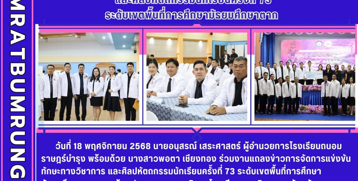 วันที่ 18 พฤศจิกายน 2568 นายอนุสรณ์ เสระศาสตร์ ผู้อำนวยการโรงเรียนถนอมราษฎร์บำรุง พร้อมด้วย นางสาวพอตา เชียงทอง ร่วมงานแถลงข่าวการจัดการแข่งขันทักษะทางวิชาการ และศิลปหัตถกรรมนักเรียนครั้งที่ 73 ระดับเขตพื้นที่การศึกษามัธยมศึกษาตาก ณ ห้องประชุมกาญจนาภิเษก โรงเรียนตากพิทยาคม จังหวัดตาก