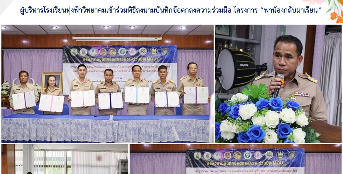 ผู้บริหารโรงเรียนทุ่งฟ้าวิทยาคมเข้าร่วมพิธีลงนามบันทึกข้อตกลงความร่วมมือ โครงการ “พาน้องกลับมาเรียน” MOU : วันจันทร์ ที่ 24 เมษายน 2566 ว่าที่ร้อยตรีอาคม มาจันทร์ ผู้อำนวยการโรงเรียนทุ่งฟ้าวิทยาคม เข้าร่วมพิธีลงนามบันทึกข้อตกลงความร่วมมือ โครงการ “พาน้องกลับมาเรียน” ระหว่างสำนักงานเขตพื้นที่การศึกษามัธยมศึกษาตาก กับโรงเรียนในสังกัดสำนักงานเขตพื้นที่การศึกษามัธยมศึกษาตาก จำนวน 21 โรงเรียน โดยมี ส.ต.ต.นปดล นพเคราะห์ เป็นประธานในพิธี ณ ห้องประชุมทองกวาว โรงเรียนผดุงปัญญา อำเภอเมืองตาก จังหวัดตาก