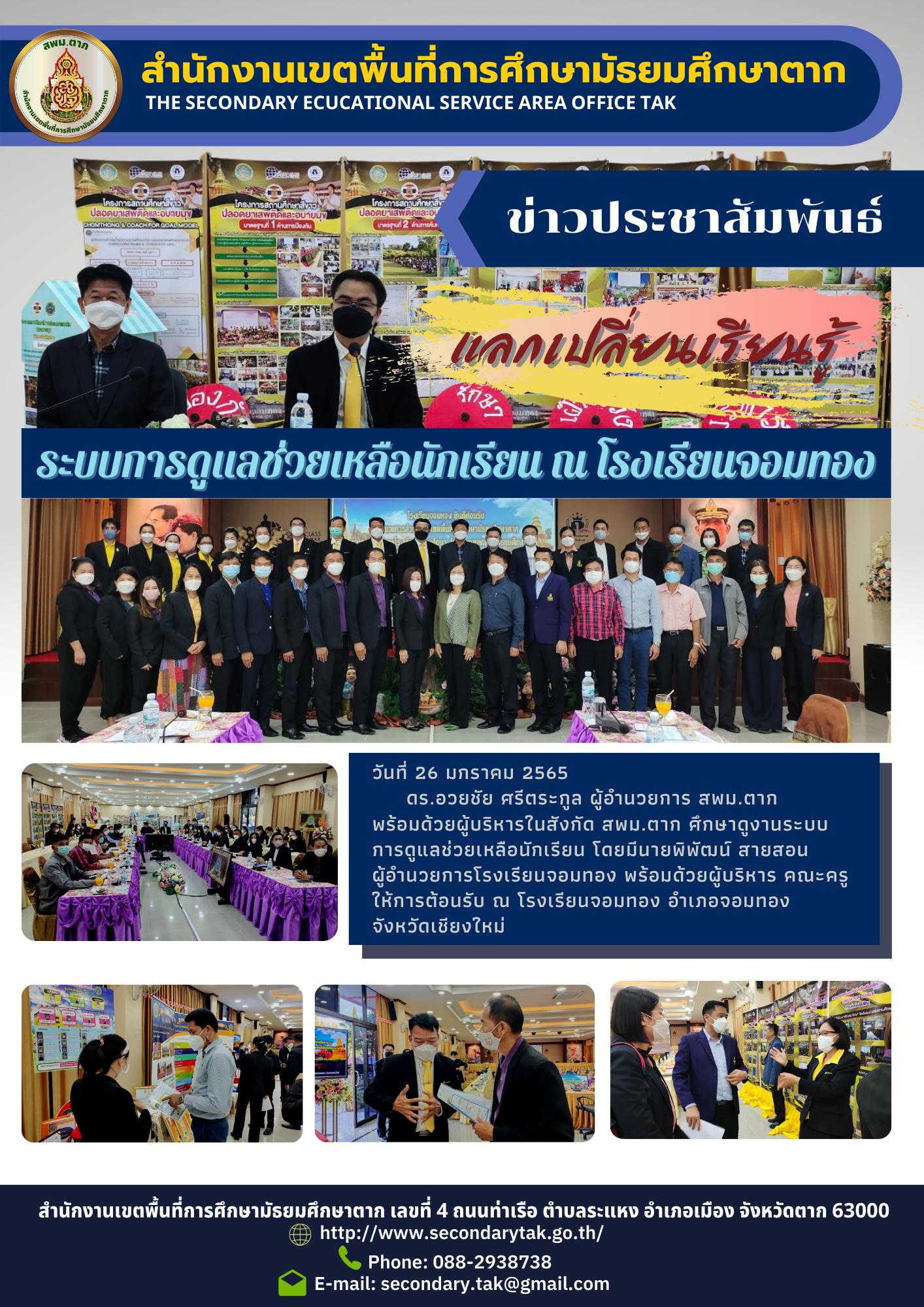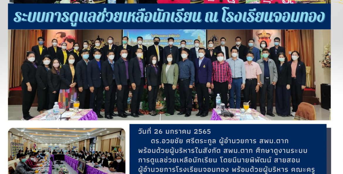 วันที่ 26 มกราคม 2565 ดร.อวยชัย ศรีตระกูล ผู้อำนวยการ สพม.ตาก พร้อมด้วยผู้บริหารในสังกัด สพม.ตาก ศึกษาดูงานระบบการดูแลช่วยเหลือนักเรียน โดยมีนายพิพัฒน์ สายสอน ผู้อำนวยการโรงเรียนจอมทอง พร้อมด้วยผู้บริหาร คณะครู ให้การต้อนรับ ณ โรงเรียนจอมทอง อำเภอจอมทอง จังหวัดเชียงใหม่