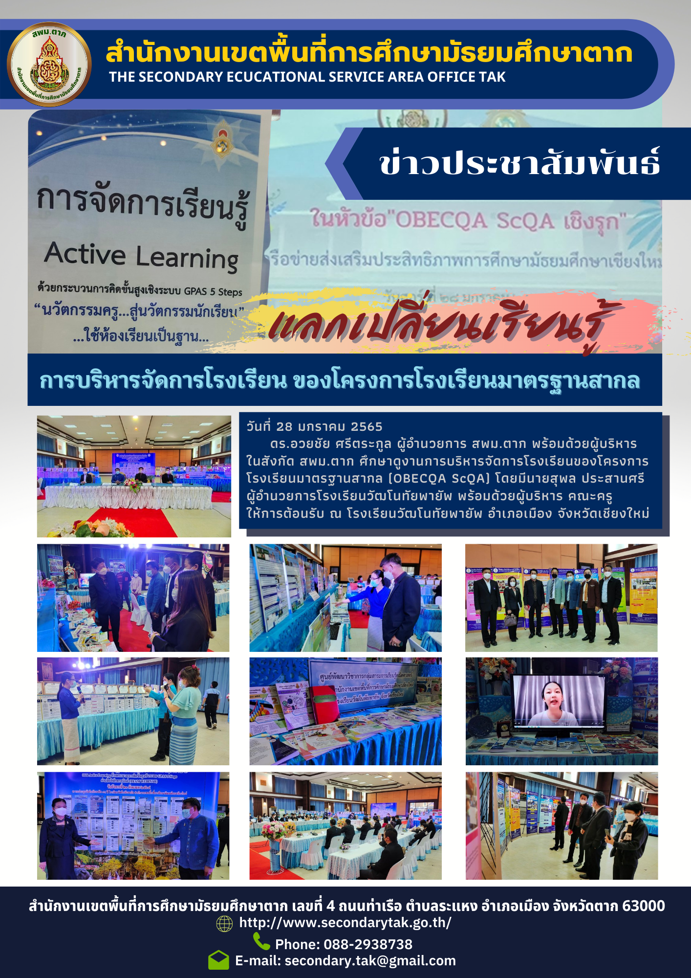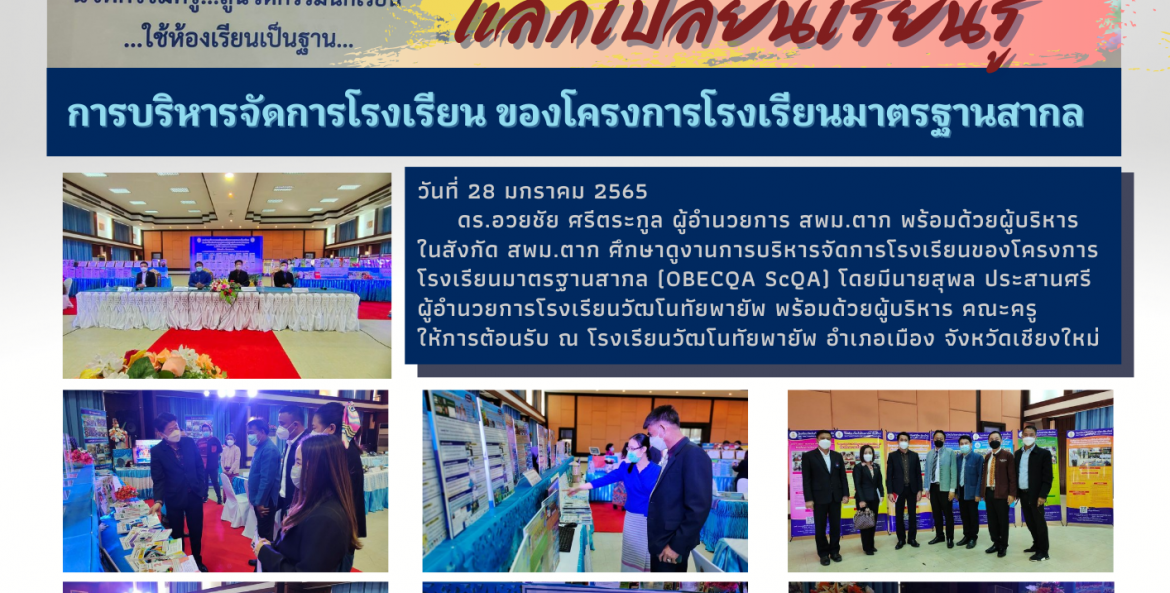 วันที่ 28 มกราคม 2565 ดร.อวยชัย ศรีตระกูล ผู้อำนวยการ สพม.ตาก พร้อมด้วยผู้บริหาร ในสังกัด สพม.ตาก ศึกษาดูงานการบริหารจัดการโรงเรียนของโครงการโรงเรียนมาตรฐานสากล (OBECQA ScQA) โดยมีนายสุพล ประสานศรี ผู้อำนวยการโรงเรียนวัฒโนทัยพายัพ พร้อมด้วยผู้บริหาร คณะครู ให้การต้อนรับ ณ โรงเรียนวัฒโนทัยพายัพ อำเภอเมือง จังหวัดเชียงใหม่