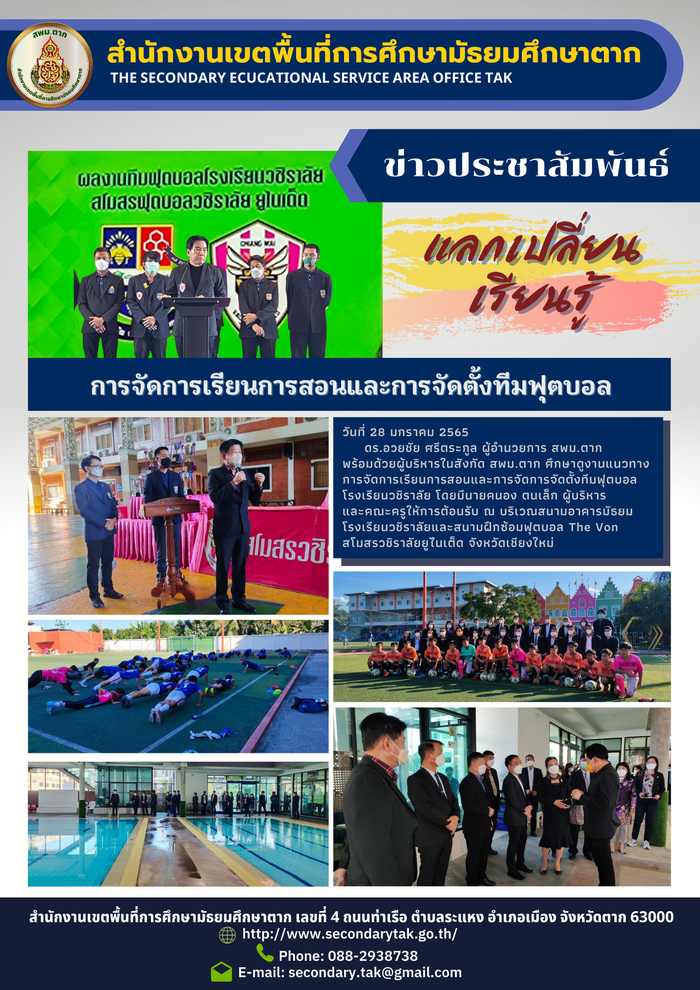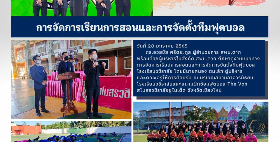 วันที่ 28 มกราคม 2565 ดร.อวยชัย ศรีตระกูล ผู้อำนวยการ สพม.ตาก พร้อมด้วยผู้บริหารในสังกัด สพม.ตาก ศึกษาดูงานแนวทางการจัดการเรียนการสอนและการจัดการจัดตั้งทีมฟุตบอล โรงเรียนวชิราลัย โดยมีนายคนอง ตนเล็ก ผู้บริหาร และคณะครูให้การต้อนรับ ณ บริเวณสนามอาคารมัธยม โรงเรียนวชิราลัยและสนามฝึกซ้อมฟุตบอล The Von สโมสรวชิราลัยยูไนเต็ด จังหวัดเชียงใหม่