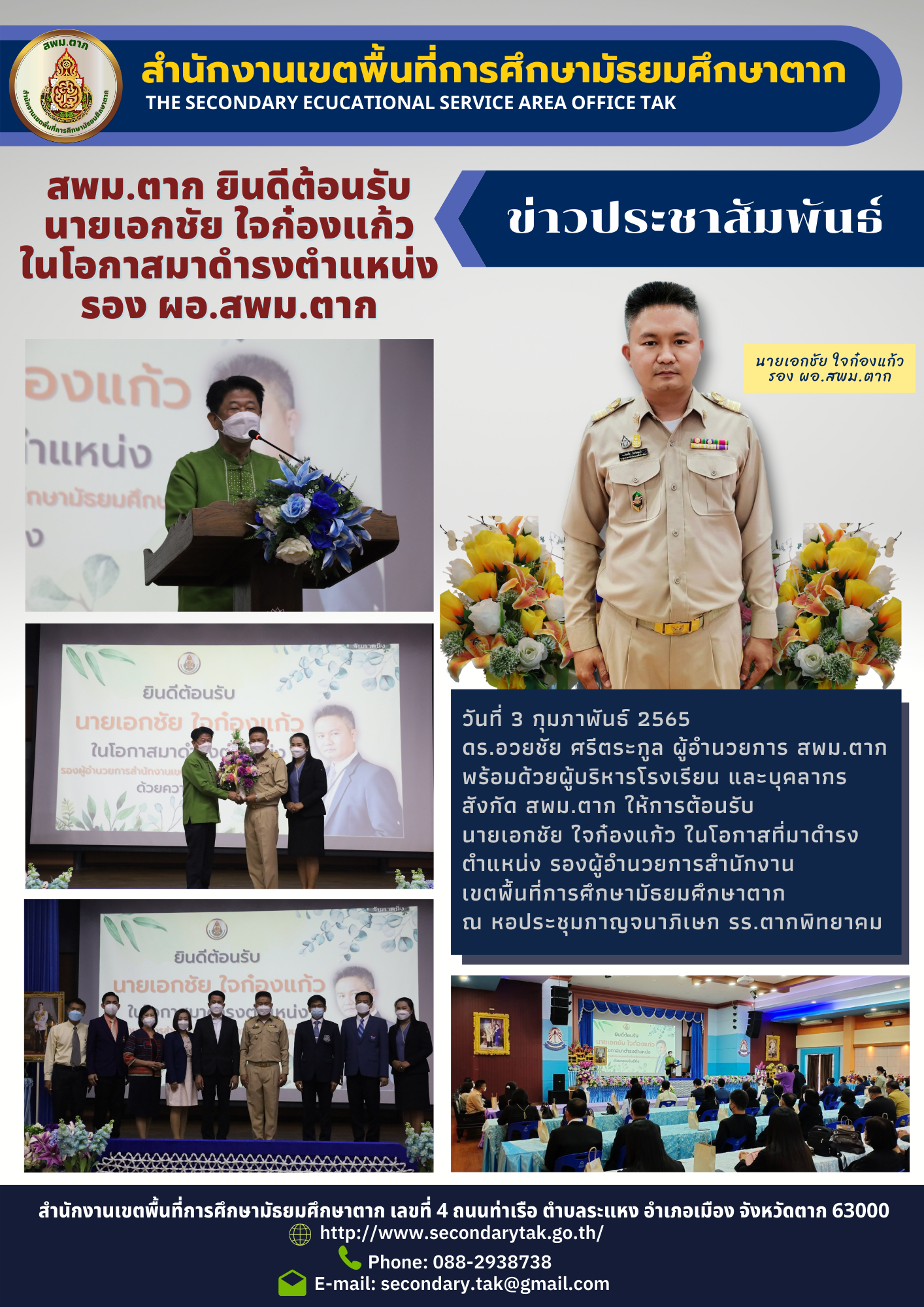 วันที่ 3 กุมภาพันธ์ 2565 ดร.อวยชัย ศรีตระกูล ผู้อำนวยการ สพม.ตาก พร้อมด้วยผู้บริหารโรงเรียน และบุคลากรสังกัด สพม.ตาก ให้การต้อนรับ นายเอกชัย ใจก๋องแก้ว ในโอกาสที่มาดำรงตำแหน่ง รองผู้อำนวยการสำนักงานเขตพื้นที่การศึกษามัธยมศึกษาตาก ณ หอประชุมกาญจนาภิเษก รร.ตากพิทยาคม