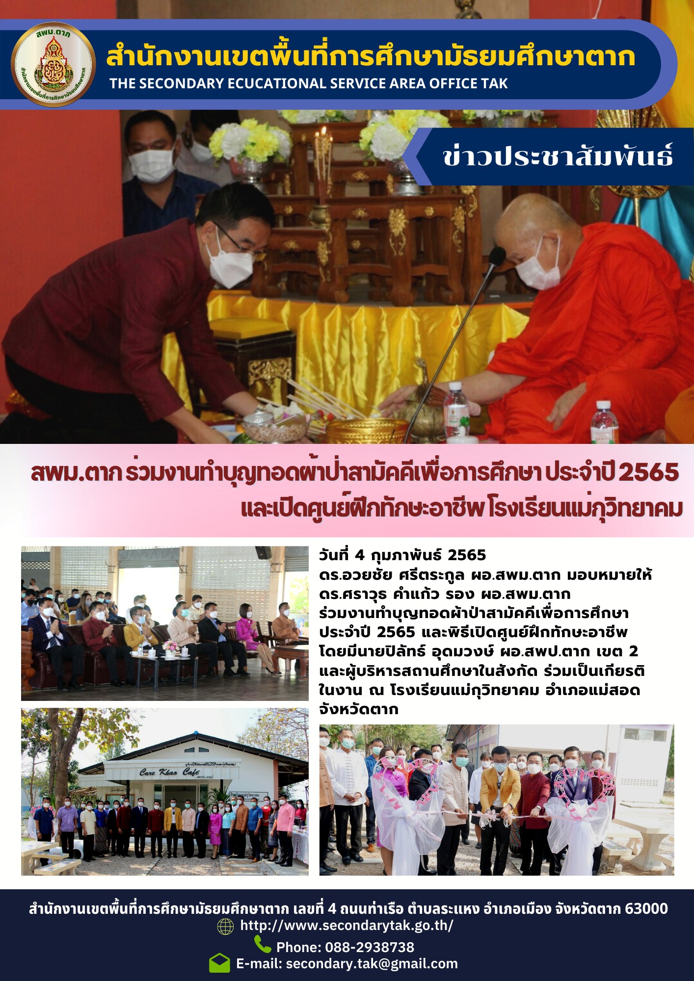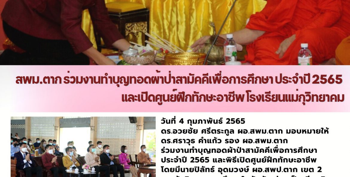 วันที่ 4 กุมภาพันธ์ 2565 ดร.อวยชัย ศรีตระกูล ผอ.สพม.ตาก มอบหมายให้ ดร.ศราวุธ คำแก้ว รอง ผอ.สพม.ตาก ร่วมงานทำบุญทอดผ้าป่าสามัคคีเพื่อการศึกษา ประจำปี 2565 และพิธีเปิดศูนย์ฝึกทักษะอาชีพ โดยมีนายปิลัทธ์ อุดมวงษ์ ผอ.สพป.ตาก เขต 2 และผู้บริหารสถานศึกษาในสังกัด ร่วมเป็นเกียรติในงาน ณ โรงเรียนแม่กุวิทยาคม อำเภอแม่สอด จังหวัดตาก