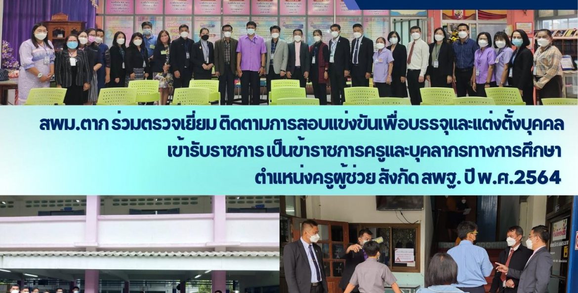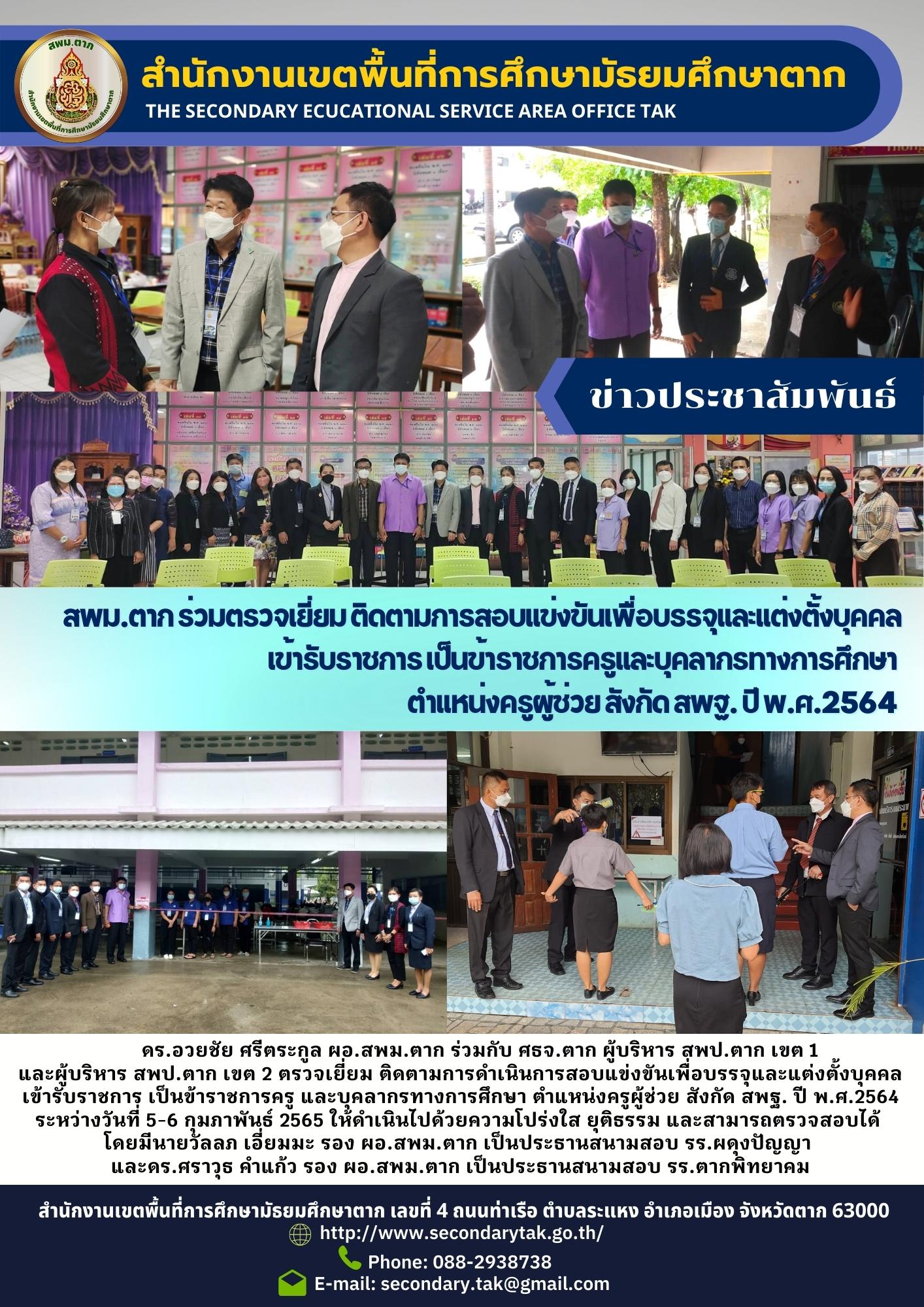ดร.อวยชัย ศรีตระกูล ผอ.สพม.ตาก ร่วมกับ ศธจ.ตาก ผู้บริหาร สพป.ตาก เขต 1 และผู้บริหาร สพป.ตาก เขต 2 ตรวจเยี่ยม ติดตามการดำเนินการสอบแข่งขันเพื่อบรรจุและแต่งตั้งบุคคล เข้ารับราชการ เป็นข้าราชการครู และบุคลากรทางการศึกษา ตำแหน่งครูผู้ช่วย สังกัด สพฐ. ปี พ.ศ.2564 ระหว่างวันที่ 5-6 กุมภาพันธ์ 2565 ให้ดำเนินไปด้วยความโปร่งใส ยุติธรรม และสามารถตรวจสอบได้ โดยมีนายวัลลภ เอี่ยมมะ รอง ผอ.สพม.ตาก เป็นประธานสนามสอบ รร.ผดุงปัญญา และดร.ศราวุธ คำแก้ว รอง ผอ.สพม.ตาก เป็นประธานสนามสอบ รร.ตากพิทยาคม
