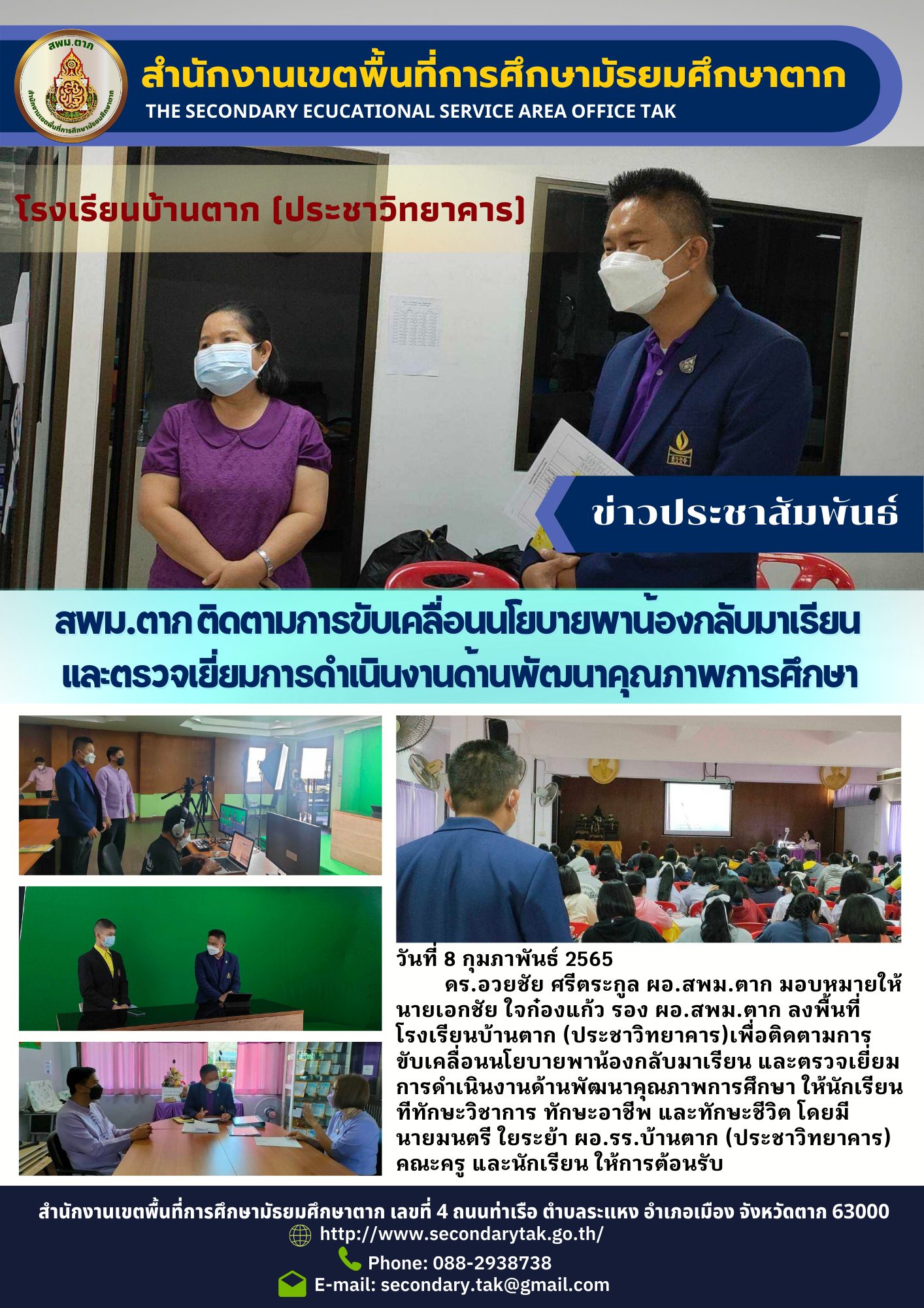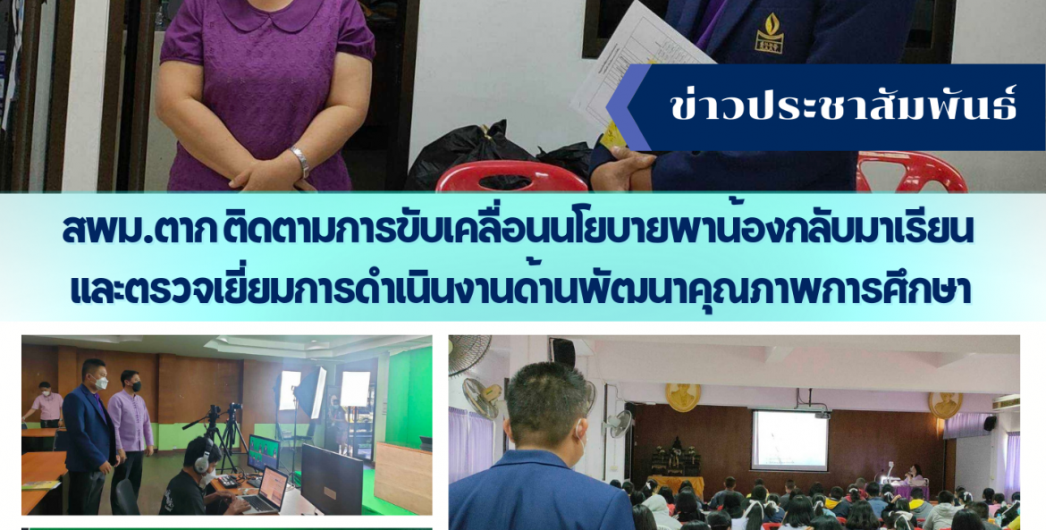 วันที่ 8 กุมภาพันธ์ 2565 ดร.อวยชัย ศรีตระกูล ผอ.สพม.ตาก มอบหมายให้นายเอกชัย ใจก๋องแก้ว รอง ผอ.สพม.ตาก ลงพื้นที่โรงเรียนบ้านตาก (ประชาวิทยาคาร)เพื่อติดตามการขับเคลื่อนนโยบายพาน้องกลับมาเรียน และตรวจเยี่ยมการดำเนินงานด้านพัฒนาคุณภาพการศึกษา ให้นักเรียนทีทักษะวิชาการ ทักษะอาชีพ และทักษะชีวิต โดยมี นายมนตรี ใยระย้า ผอ.รร.บ้านตาก (ประชาวิทยาคาร) คณะครู และนักเรียน ให้การต้อนรับ