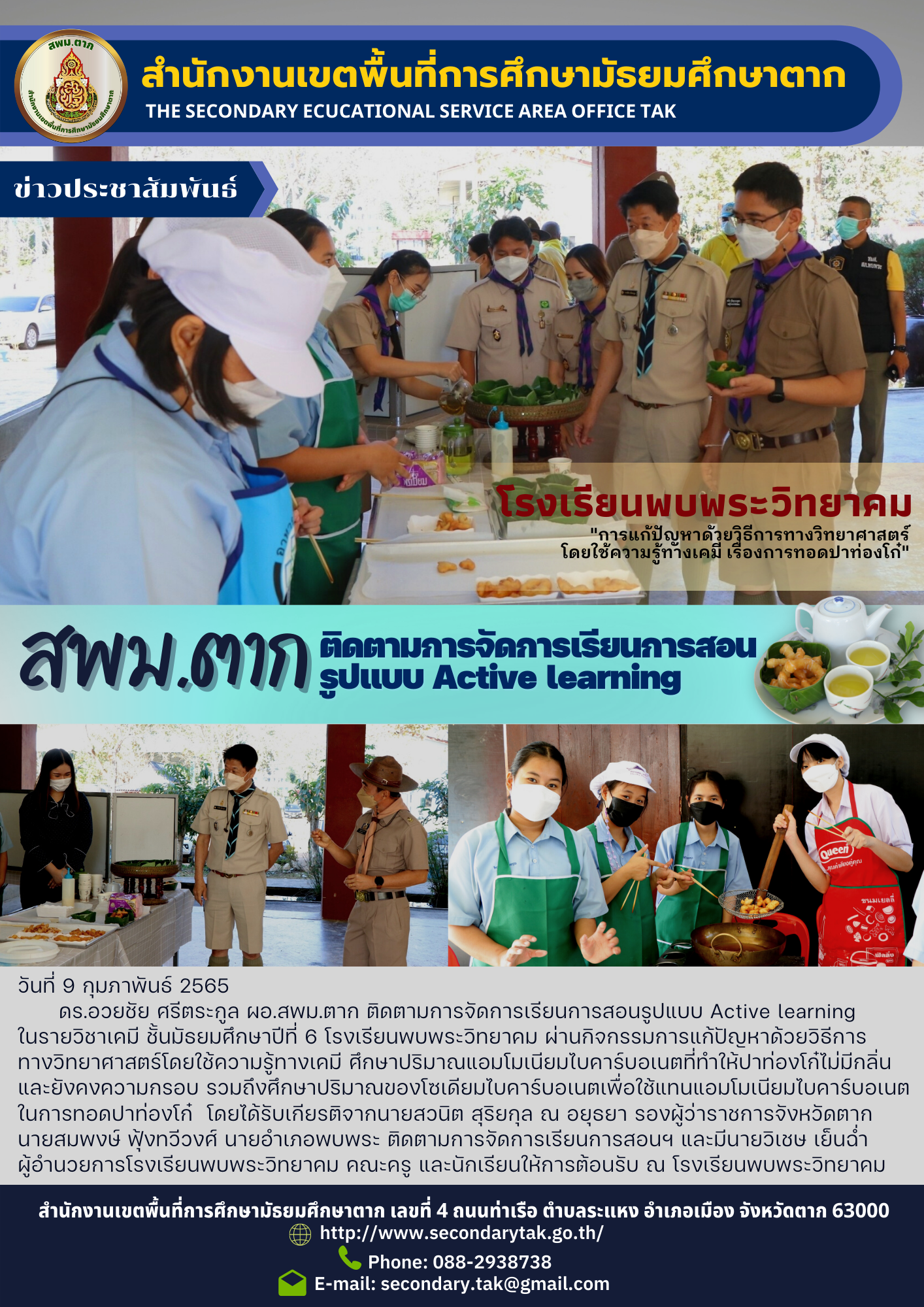 วันที่ 9 กุมภาพันธ์ 2565 ดร.อวยชัย ศรีตระกูล ผอ.สพม.ตาก ติดตามการจัดการเรียนการสอนรูปแบบ Active learning ในรายวิชาเคมี ชั้นมัธยมศึกษาปีที่ 6 โรงเรียนพบพระวิทยาคม ผ่านกิจกรรมการแก้ปัญหาด้วยวิธีการทางวิทยาศาสตร์โดยใช้ความรู้ทางเคมี ศึกษาปริมาณแอมโมเนียมไบคาร์บอเนตที่ทำให้ปาท่องโก๋ไม่มีกลิ่น