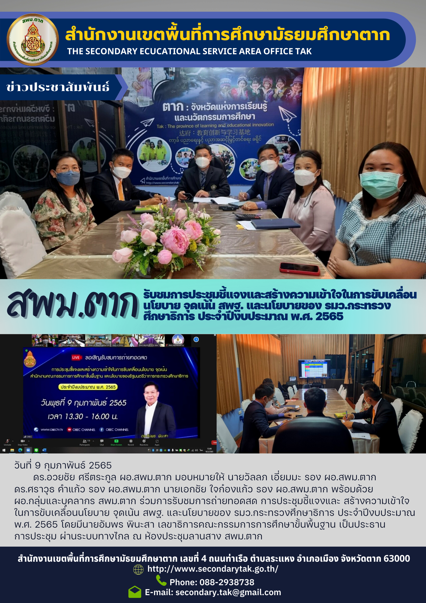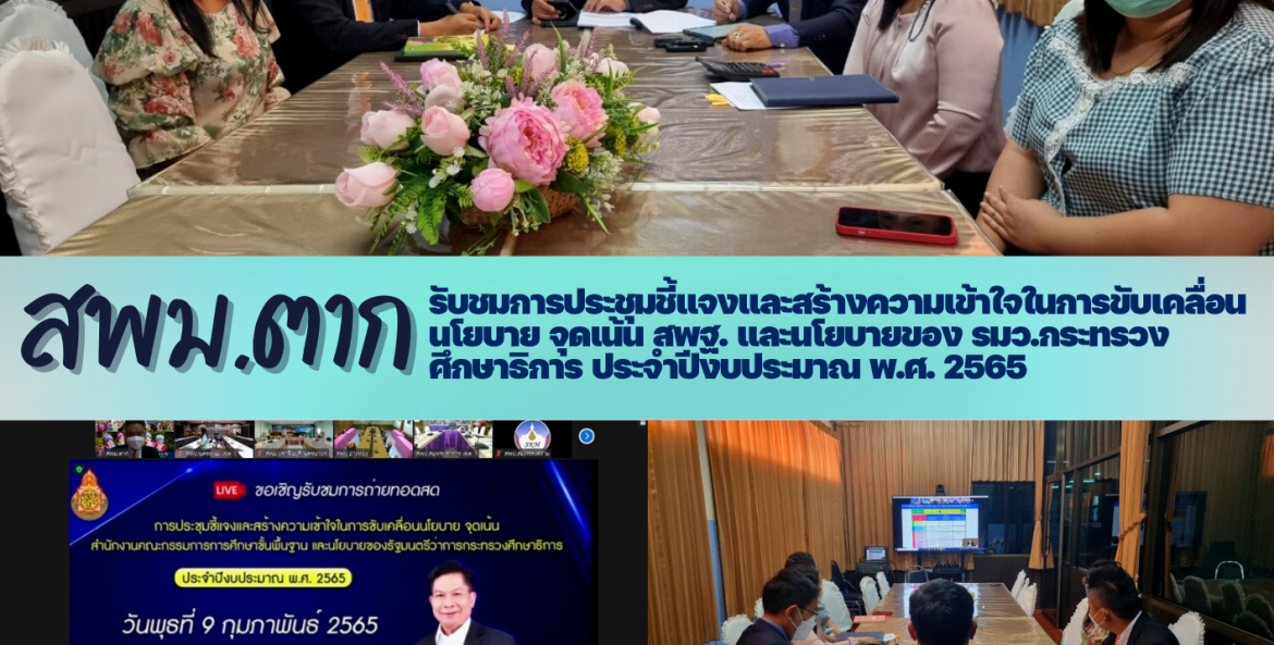 ดร.ศราวุธ คำแก้ว รอง ผอ.สพม.ตาก นายเอกชัย ใจก๋องแก้ว รอง ผอ.สพม.ตาก พร้อมด้วย ผอ.กลุ่มและบุคลากร สพม.ตาก ร่วมการรับชมการถ่ายทอดสด การประชุมชี้แจงและ สร้างความเข้าใจในการขับเคลื่อนนโยบาย จุดเน้น สพฐ. และนโยบายของ รมว.กระทรวงศึกษาธิการ ประจำปีงบประมาณ พ.ศ. 2565 โดยมีนายอัมพร พินะสา เลขาธิการคณะกรรมการการศึกษาขั้นพื้นฐาน เป็นประธาน การประชุม ผ่านระบบทางไกล ณ ห้องประชุมลานสาง สพม.ตาก