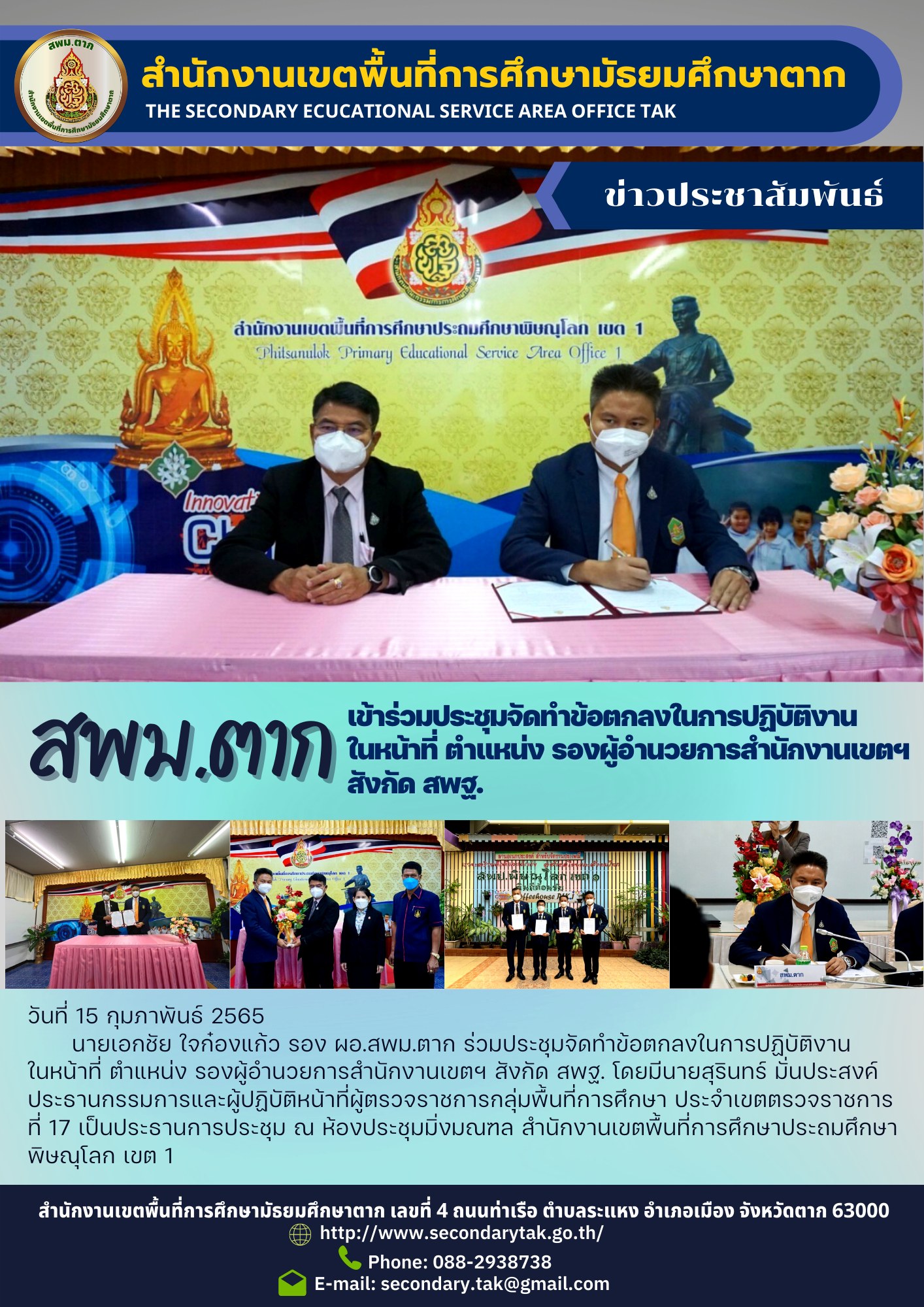 วันที่ 15 กุมภาพันธ์ 2565 นายเอกชัย ใจก๋องแก้ว รอง ผอ.สพม.ตาก ร่วมประชุมจัดทำข้อตกลงในการปฏิบัติงาน ในหน้าที่ ตำแหน่ง รองผู้อำนวยการสำนักงานเขตฯ สังกัด สพฐ. โดยมีนายสุรินทร์ มั่นประสงค์ ประธานกรรมการและผู้ปฏิบัติหน้าที่ผู้ตรวจราชการกลุ่มพื้นที่การศึกษา ประจำเขตตรวจราชการที่ 17 เป็นประธานการประชุม ณ ห้องประชุมมิ่งมณฑล สำนักงานเขตพื้นที่การศึกษาประถมศึกษาพิษณุโลก เขต 1
