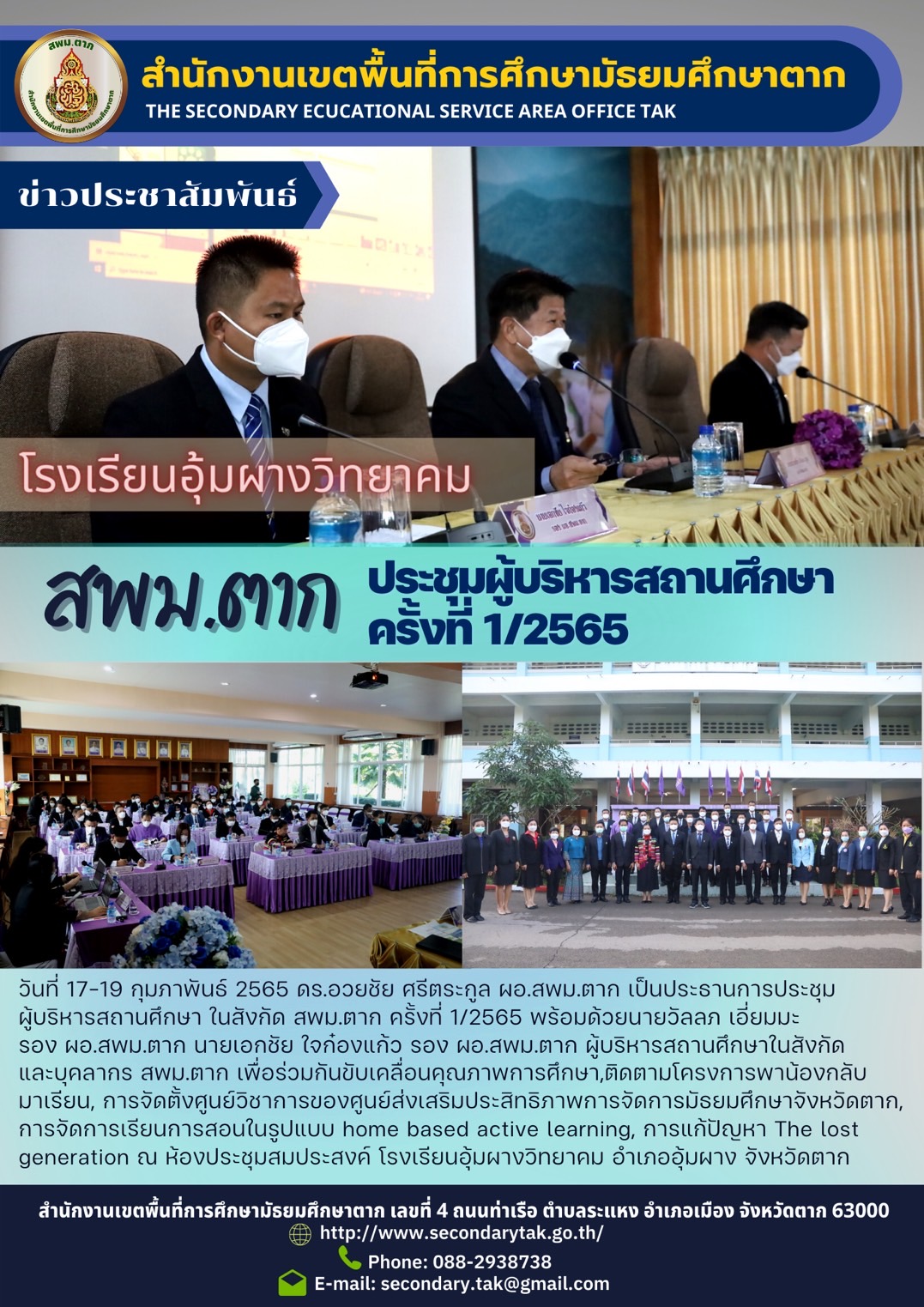 วันที่ 17-19 กุมภาพันธ์ 2565 ดร.อวยชัย ศรีตระกูล ผอ.สพม.ตาก เป็นประธานการประชุมผู้บริหารสถานศึกษา ในสังกัด สพม.ตาก ครั้งที่ 1/2565 พร้อมด้วยนายวัลลภ เอี่ยมมะ รอง ผอ.สพม.ตาก นายเอกชัย ใจก๋องแก้ว รอง ผอ.สพม.ตาก ผู้บริหารสถานศึกษาในสังกัด และบุคลากร สพม.ตาก เพื่อร่วมกันขับเคลื่อนคุณภาพการศึกษา,ติดตามโครงการพาน้องกลับมาเรียน, การจัดตั้งศูนย์วิชาการของศูนย์ส่งเสริมประสิทธิภาพการจัดการมัธยมศึกษาจังหวัดตาก, การจัดการเรียนการสอนในรูปแบบ home based active learning, การแก้ปัญหา The lost generation ณ ห้องประชุมสมประสงค์ โรงเรียนอุ้มผางวิทยาคม อำเภออุ้มผาง จังหวัดตาก