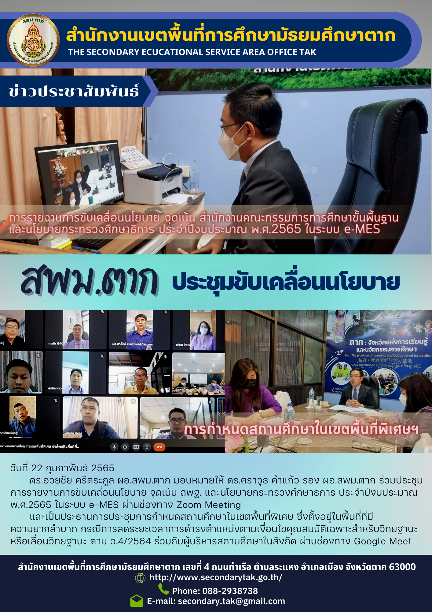 วันที่ 22 กุมภาพันธ์ 2565ดร.อวยชัย ศรีตระกูล ผอ.สพม.ตาก มอบหมายให้ ดร.ศราวุธ คำแก้ว รอง ผอ.สพม.ตาก ร่วมประชุมการรายงานการขับเคลื่อนนโยบาย จุดเน้น สพฐ. และนโยบายกระทรวงศึกษาธิการ ประจำปีงบประมาณ พ.ศ.2565 ในระบบ e-MES ผ่านช่องทาง Zoom Meeting และเป็นประธานการประชุมการกำหนดสถานศึกษาในเขตพื้นที่พิเศษ ซึ่งตั้งอยู่ในพื้นที่ที่มีความยากลำบาก กรณีการลดระยะเวลาการดำรงตำแหน่งตามเงื่อนไขคุณสมบัติเฉพาะสำหรับวิทยฐานะหรือเลื่อนวิทยฐานะ ตาม ว.4/2564 ร่วมกับผู้บริหารสถานศึกษาในสังกัด ผ่านช่องทาง Google Meet