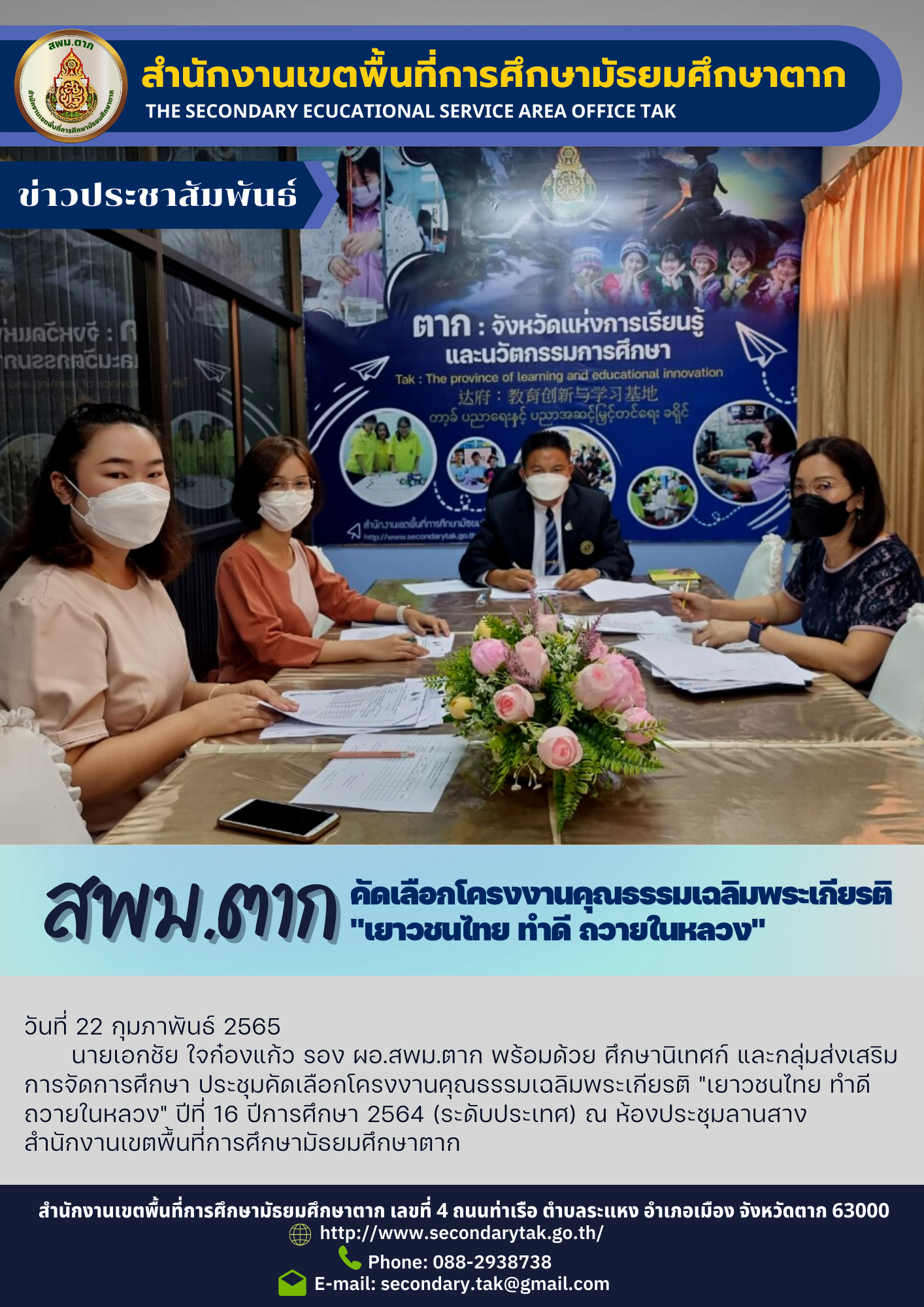 วันที่ 22 กุมภาพันธ์ 2565 นายเอกชัย ใจก๋องแก้ว รอง ผอ.สพม.ตาก พร้อมด้วย ศึกษานิเทศก์ และกลุ่มส่งเสริมการจัดการศึกษา ประชุมคัดเลือกโครงงานคุณธรรมเฉลิมพระเกียรติ “เยาวชนไทย ทำดี ถวายในหลวง” ปีที่ 16 ปีการศึกษา 2564 (ระดับประเทศ) ณ ห้องประชุมลานสาง สำนักงานเขตพื้นที่การศึกษามัธยมศึกษาตาก