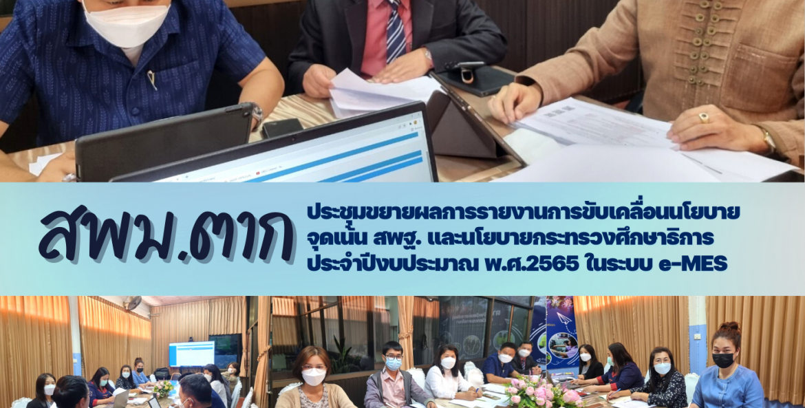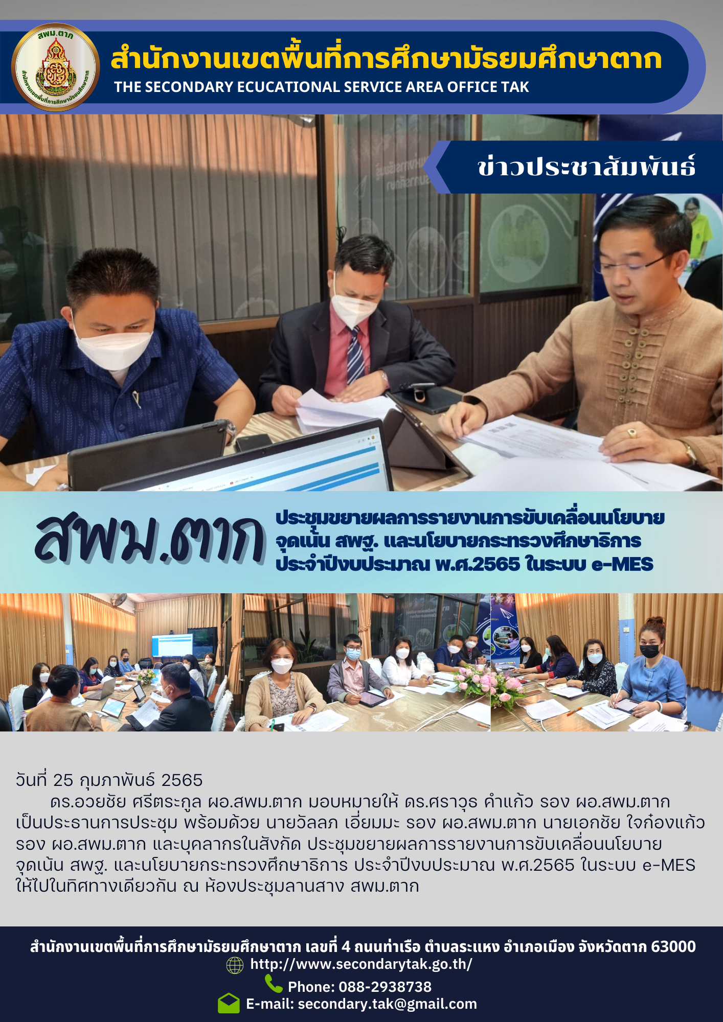 วันที่ 25 กุมภาพันธ์ 2565 ดร.อวยชัย ศรีตระกูล ผอ.สพม.ตาก มอบหมายให้ ดร.ศราวุธ คำแก้ว รอง ผอ.สพม.ตาก เป็นประธานการประชุม พร้อมด้วย นายวัลลภ เอี่ยมมะ รอง ผอ.สพม.ตาก นายเอกชัย ใจก๋องแก้ว รอง ผอ.สพม.ตาก และบุคลากรในสังกัด ประชุมขยายผลการรายงานการขับเคลื่อนนโยบาย จุดเน้น สพฐ. และนโยบายกระทรวงศึกษาธิการ ประจำปีงบประมาณ พ.ศ.2565 ในระบบ e-MES ให้ไปในทิศทางเดียวกัน ณ ห้องประชุมลานสาง สพม.ตาก