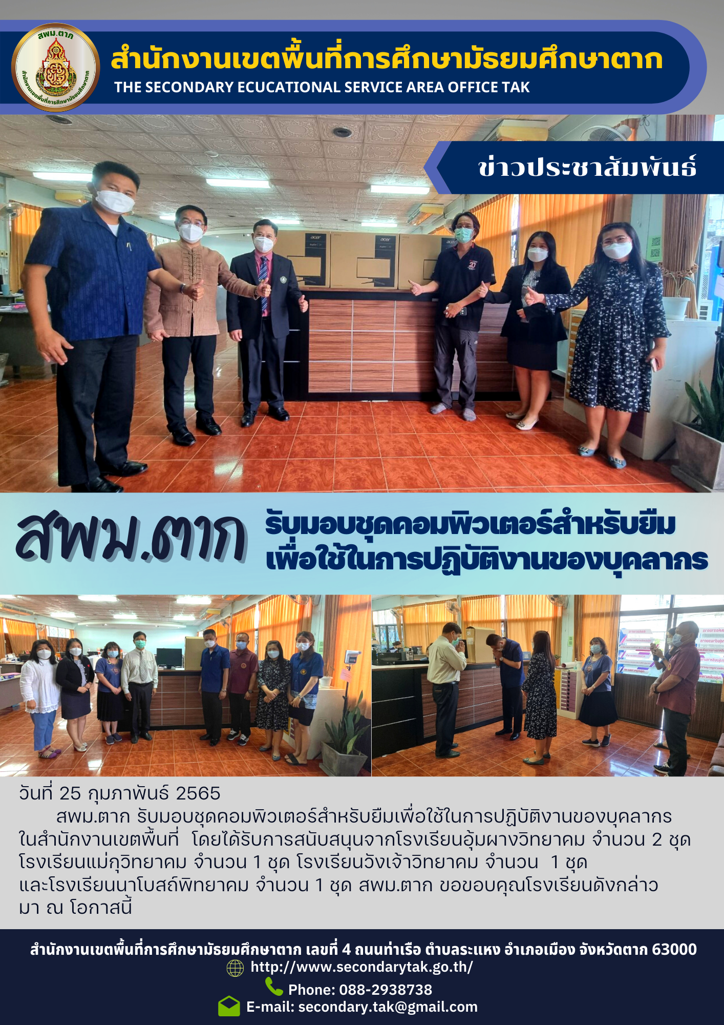 วันที่ 25 กุมภาพันธ์ 2565 สพม.ตาก รับมอบชุดคอมพิวเตอร์สำหรับยืมเพื่อใช้ในการปฏิบัติงานของบุคลากร ในสำนักงานเขตพื้นที่ โดยได้รับการสนับสนุนจากโรงเรียนอุ้มผางวิทยาคม จำนวน 2 ชุดโรงเรียนแม่กุวิทยาคม จำนวน 1 ชุด โรงเรียนวังเจ้าวิทยาคม จำนวน 1 ชุด และโรงเรียนนาโบสถ์พิทยาคม จำนวน 1 ชุด สพม.ตาก ขอขอบคุณโรงเรียนดังกล่าวมา ณ โอกาสนี้