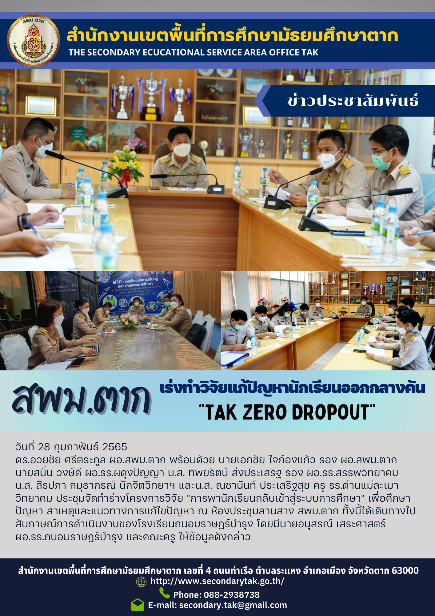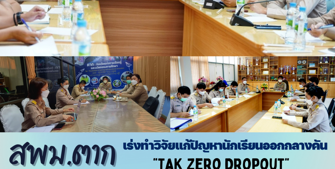 วันที่ 28 กุมภาพันธ์ 2565 ดร.อวยชัย ศรีตระกูล ผอ.สพม.ตาก พร้อมด้วย นายเอกชัย ใจก๋องแก้ว รอง ผอ.สพม.ตาก นายสนั่น วงษ์ดี ผอ.รร.ผดุงปัญญา น.ส. ทิพยรัตน์ ส่งประเสริฐ รอง ผอ.รร.สรรพวิทยาคม น.ส. สิรปภา กมุธากรณ์ นักจิตวิทยาฯ และน.ส. ณชานันท์ ประเสริฐสุข ครู รร.ด่านแม่ละเมาวิทยาคม ประชุมจัดทำร่างโครงการวิจัย “การพานักเรียนกลับเข้าสู่ระบบการศึกษา” เพื่อศึกษาปัญหา สาเหตุและแนวทางการแก้ไขปัญหา ณ ห้องประชุมลานสาง สพม.ตาก ทั้งนี้ได้เดินทางไปสัมภาษณ์การดำเนินงานของโรงเรียนถนอมราษฎร์บำรุง โดยมีนายอนุสรณ์ เสระศาสตร์ ผอ.รร.ถนอมราษฎร์บำรุง และคณะครู ให้ข้อมูลดังกล่าว