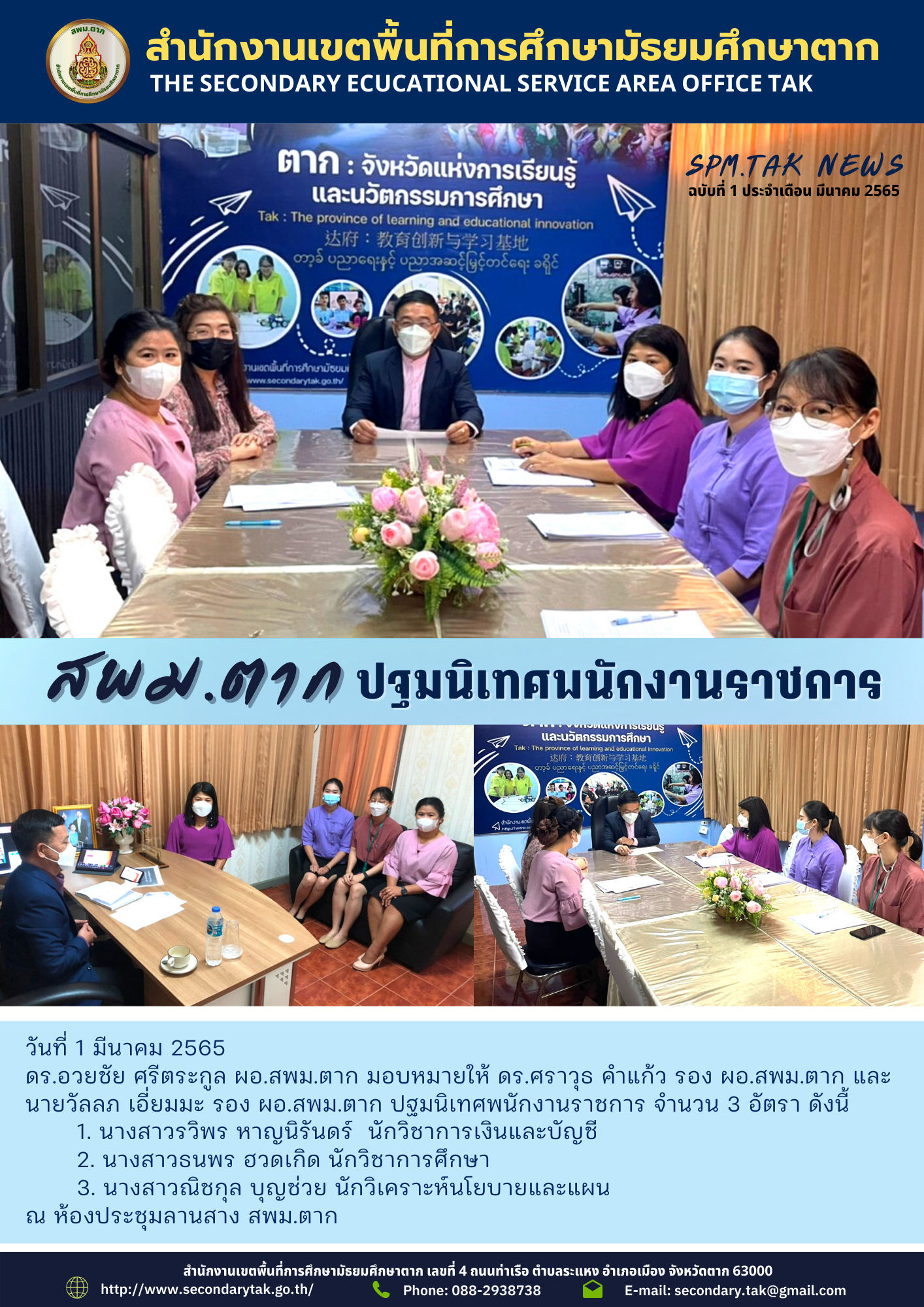 วันที่ 1 มีนาคม 2565 ดร.อวยชัย ศรีตระกูล ผอ.สพม.ตาก มอบหมายให้ ดร.ศราวุธ คำแก้ว รอง ผอ.สพม.ตาก และนายวัลลภ เอี่ยมมะ รอง ผอ.สพม.ตาก ปฐมนิเทศพนักงานราชการ จำนวน 3 อัตรา ดังนี้